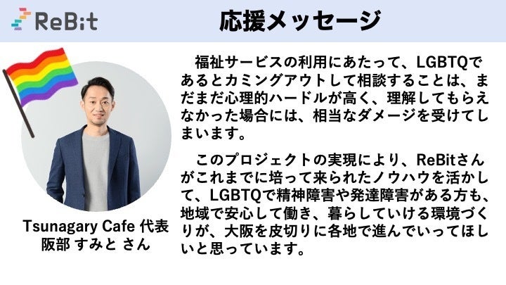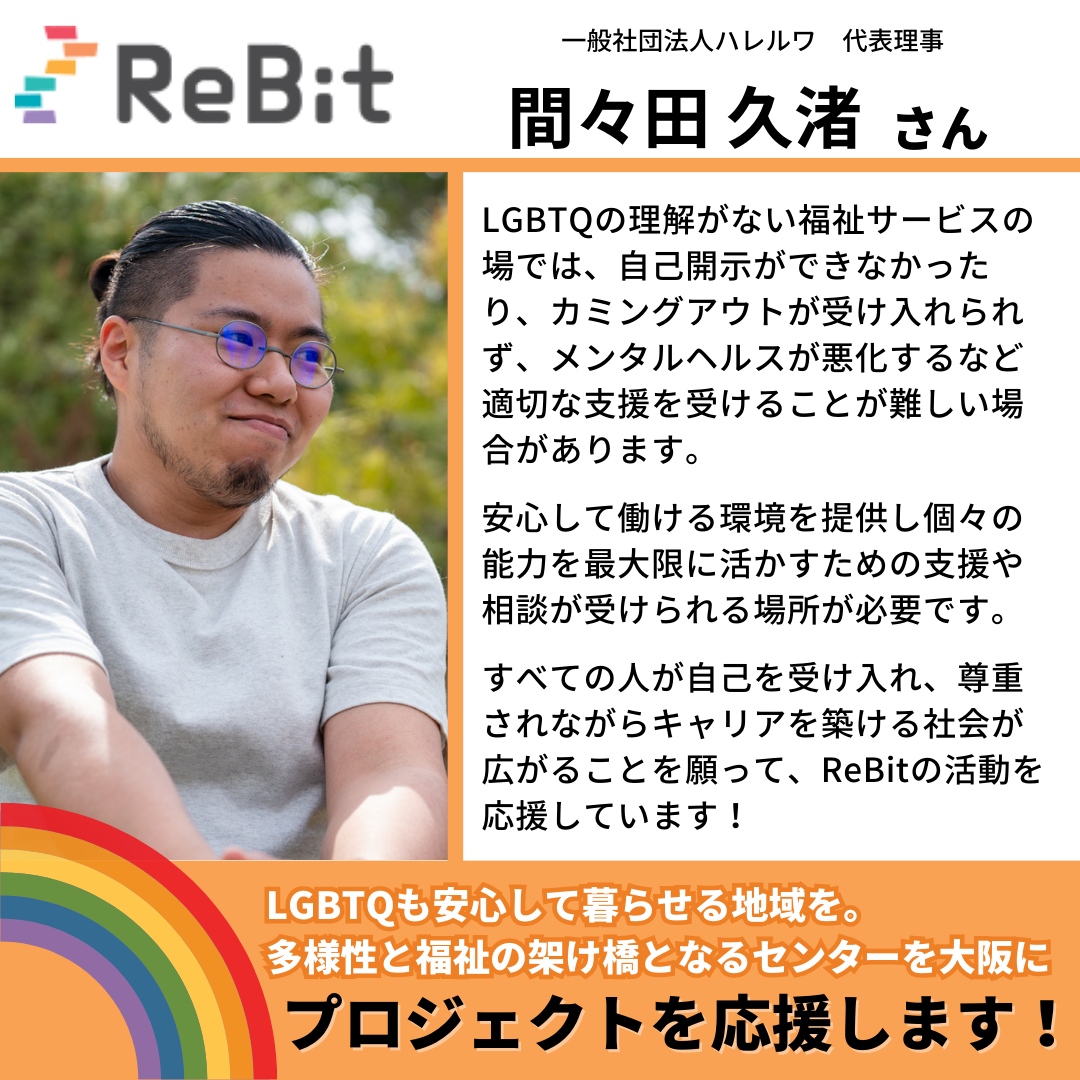 2023/06/30 12:00間々田 久渚さん(一般社団法人ハレルワ 代表理事)からクラウドファンディングへの応援メッセージをいただきました。ありがとうございます!ーーーーーLGBTQの理解がない福祉サービスの場では、自己開示ができなかったり、カミングアウトが受け入れられず、メンタルヘルスが悪化するなど適切な支援を受けることが難しい場合があります。安心して働ける環境を提供し個々の能力を最大限に活かすための支援や相談が受けられる場所が必要です。すべての人が自己を受け入れ、尊重されながらキャリアを築ける社会が広がることを願って、ReBitの活動を応援しています!ーーーーー【LGBTQと福祉 の架け橋となるセンターを大阪に】自治体や障害福祉事業者等の社会資源がLGBTQへの理解を促進し安全に利用できる環境創りが必要です。その挑戦の第一歩として、大阪市天満橋に「ダイバーシティキャリア大阪」を設立し、大阪府からの応援の元、地域福祉資源の啓発連携と、地域全体でのLGBTQへの安全網づくりに寄与したいと願います。本プロジェクトは大阪府・村上財団にご支援を頂きマッチング寄付としてあなたのご寄付が2倍になります!ぜひ、参加・応援をお願いします。あなたの力が必要です。 もっと見る