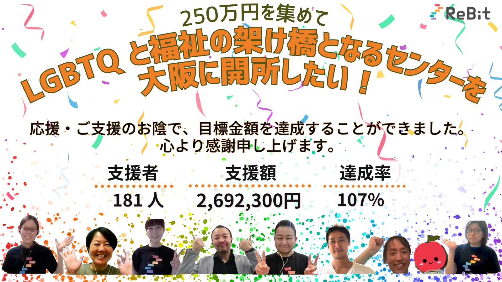 2023/07/01 12:55ReBitは、5月18日(木)から6月30日(金)まで、44日間にわたってクラウドファンディングに挑戦をいたしました。お陰様で181人からのご支援により、目標金額を超える2,692,300円まで達成することができました。ご支援・応援を頂き、本当にありがとうございます。「まだまだ理解も支援も十分ではない中、皆さんの活動に勇気づけられる方は相当いると思います!引き続き応援させてください!」「支援者の立場からも、継続的な支援が大切だと痛感しています。ReBtiさんと一緒に実現したいです!頑張ってください!」と、皆さんから応援の温かいメッセージも届き、とても嬉しいです。いただいたご寄付は、誰もが安全に福祉を利用できる環境創りへの挑戦の第一歩として大阪での LGBTQと福祉 の架け橋になるセンターの設立、地域福祉資源の啓発連携と地域全体でのLGBTQへの安全網づくりに大切に活用させて頂きます。引き続き、伴走いただけますようお願い申し上げます!ReBit公式サイト:https://rebitlgbt.org/継続寄付「にじいろバトン」:https://rebitlgbt.org/support/nijiirobaton もっと見る