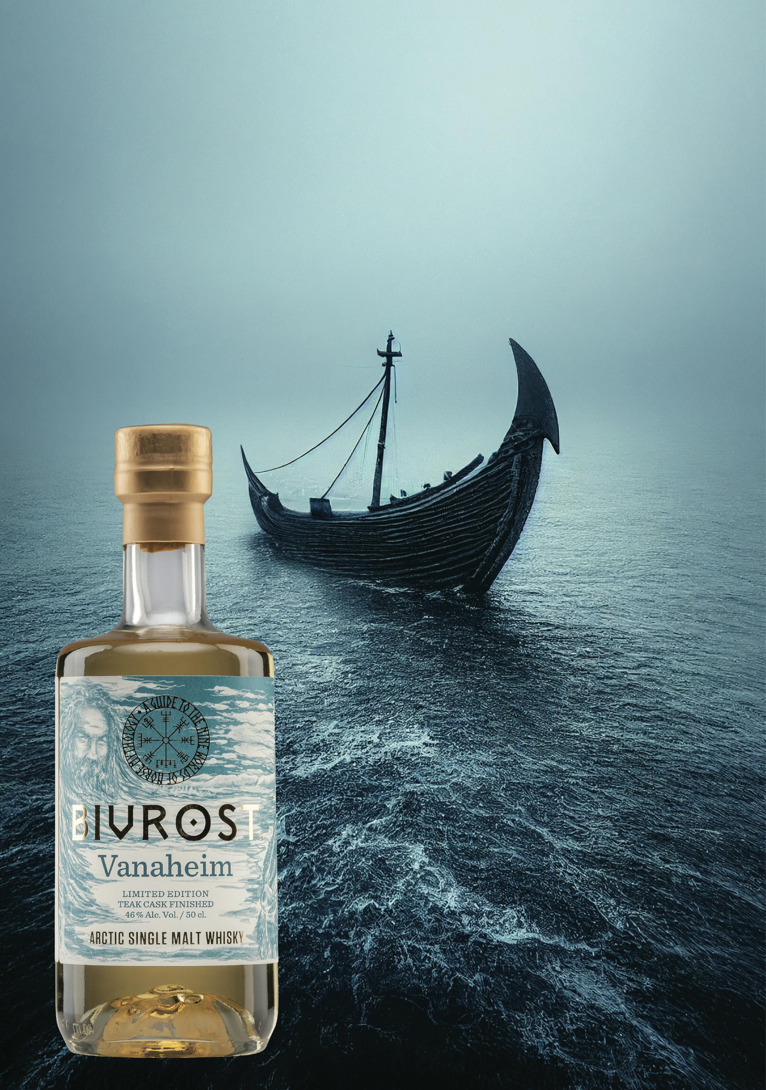 今も北欧の各地にはニョルズの名を冠した多くの地名が存在する。それは人々の信仰心を表しており、いかに神ニョルズが人々に愛され崇拝されていたかを見ることができる。そんな海の神としても名高いニョルズの故郷「ヴァナハイム」をイメージしたウイスキーは、透明感のある海の中のような美しいブルーグリーンをベースに、屈強な体格の神々しいニョルズがメインで描かれた専用のボックスに入っており、同じブルーグリーンのラベルにも静かな強さと知恵を秘めた瞳が印象的なニョルズが描かれている。海の中に差し込む太陽の光を集めたかのように黄金色に輝くヴァナハイムウイスキーは、チーク樽の影響により非常にトロピカルなフレーバーを持つ、甘く心地よい余韻がいつまでも味わっていたいと思わせる美味しくて飲みやすいウイスキーと仕上がっている。