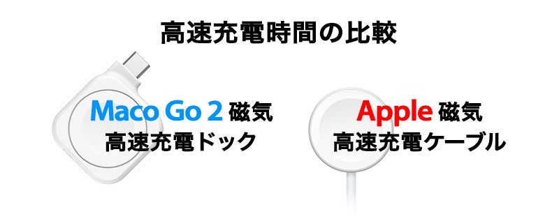 新開発のMaco USB-A to C 高速充電アダプタは、一般的なアダプタと異なります。Maco Go 2と同時開発、Apple WatchをUSB-Aポートから高速で充電します。充電時間は、USB-Cポートの高速充電時間と遜色ない高速充電が体験できます。Maco Go 2とMaco USB-A to C 高速充電アダプタがあれば、まさに鬼に金棒です。なお市販の変換アダプタは、高速充電に対応していないだけでなく、Maco Go 2で動作しませんのでご注意ください。