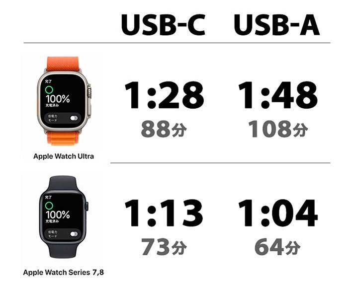 100%フル充電までかかった時間は、Series 7の場合、USB-Cより8分速く、Ultraの場合、USB-Cより15分長く時間がかかりました。(テスト実施者:エリーゼジャパン)