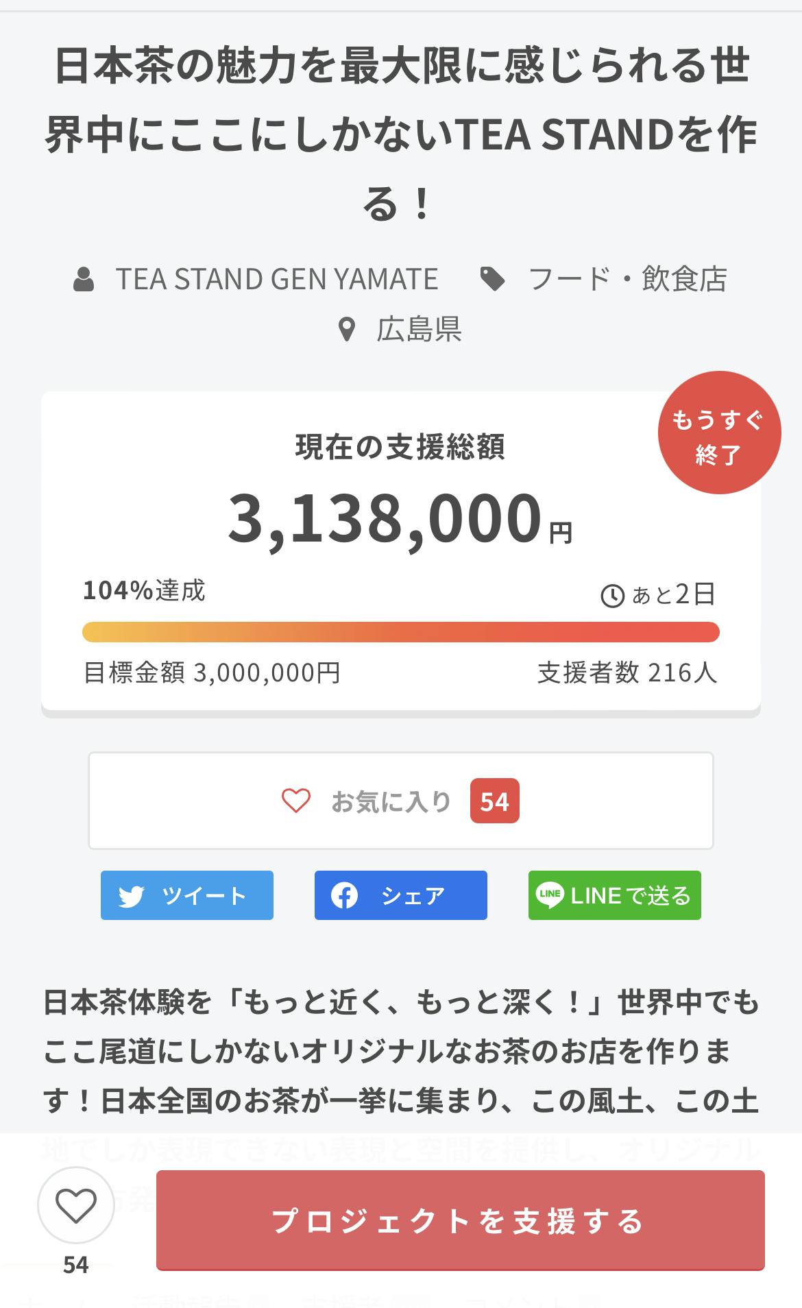 2023/05/29 23:56ご支援いただきました皆様クラウドファンディング達成させていただきました!!沢山のご支援誠にありがとう御座いました!急遽1ヶ月前にクラウドファンディングをさせて頂くと決心してからというもの正直、毎日気が気ではありませんでした。色々な出来事がこの1ヶ月で沢山おこり、まさしく一生の思い出になりました。ご支援いただいたお金は大切にお店の改装費に使わせていただきます。ご支援いただいたお金は、ご支援いただいた方々が日々汗水垂らして一生懸命働いて稼いだお金です。そのことをしっかり認識して、これからが本当の本番と気を引き締めて良いものをご提供できるように頑張ります。クラウドファンディング上の金額では達成となっておりますが、本当の達成はご支援いただいた方や、関係者、その他関わって下さった皆様の人生に少しでも何かしらの良い価値をご提供させていただくことだと思っております。お茶に出会えて良かった、茶立玄 山手が尾道、日本にあって良かったと思ってもらえるよう精一杯頑張って参ります!では残り1日となりました、リターンもまだ残っているものもございます。引き続き宜しくお願い致します。では茶立玄 山手でお逢いしましょう!高橋 もっと見る