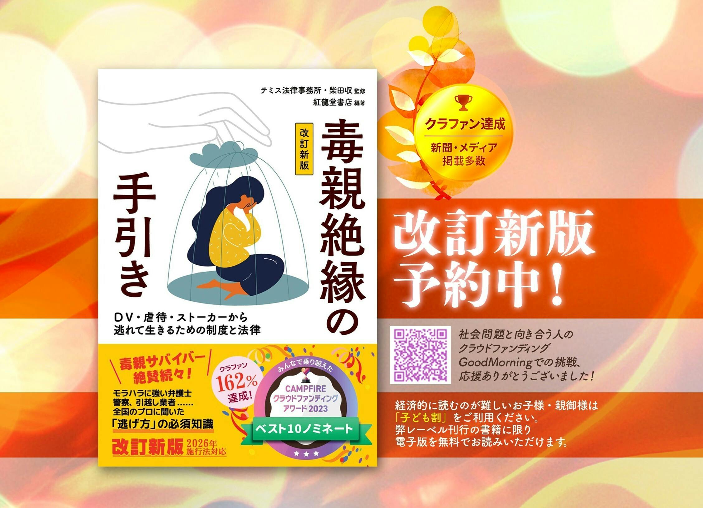 2025/10/14 20:10大変お待たせいたしました……!ついに改訂新版の刊行日が決定しました。2025年11月21日(金)、全国書店・オンライン書店にて発売予定です!ご予約受付も始まっています。ぜひ応援している書店さんでのご予約や、図書館さんへのリクエストをいただけると嬉しいです。クラウドファンディングで皆さまに応援いただいたからこそ、こうして再び本を世に送り出すことができます。本当に、本当にありがとうございます。改訂新版の主な更新点改訂新版では、今年施行された改正戸籍法・改正児童福祉法・不動産新法などに加え、マイナンバーカードの近況、また2026年施行予定の共同親権制度にも対応いたしました。さらに支援施設内の二次加害への対策や、ChatGPTなど生成AIに関する新たな法的リスクにも触れています。本文中に掲載のリンクもすべて最新版へと修正済み(2025年8月時点)。詳細はブログにも記載したのですが、スタッフ3人が新型コロナに罹患するというトラブルもあり、一時は全業務を2か月間停止せざるを得ませんでしたが、皆さまからの温かいメッセージに支えられ、なんとか完走することができました。ページ増補と価格改定について最終的には16ページ増補となり、また印刷資材の高騰や円安の影響もあって、やむを得ず本体価格を200円値上げさせていただきました。どうかご理解いただけますと幸いです。書店・電子版・図書館についてAmazonや楽天ブックスのほか、全国の書店さんからもご予約可能です。できれば「応援したい書店さん」でのご予約をお願いできたら嬉しいです!電子版は少し遅れて配信予定です。改訂版の電子書籍が整うまでは、旧版の電子版を引き続き配信してまいります。また、図書館さんでも順次導入予定です!購入が難しい方や、家庭内で書籍を持つことが危険な方は、ぜひ図書館リクエスト制度をご活用ください。おわりに政情不安に歴史的な円安と、大人が生きるのにさえ、薄氷の上を歩くような時代になりました。まっとうな親のいない家庭では、子どもは「息をすること」さえ命懸けです。あのとき皆さまが灯してくださった火が、今もどこかで息をひそめている誰かのもとへ届くことを願ってやみません。私たちもまた、ほんの少しずつではありますが、できることを見つけ、形にしてまいります。紅龍堂書店一同 もっと見る