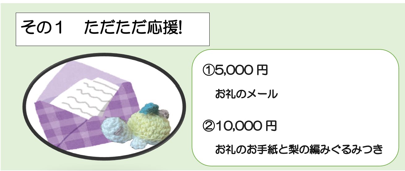 2023/08/01 05:58クラウドファンディング支援者の皆様約2か月にわたって実施したクラウドファンディングは、昨日をもって終了いたしました。皆様からの温かなご支援、拡散のおかげで、無事目標金額を達成することができました。心より感謝申し上げます。今後、私たちの活動は、かすみがうら市を中心に展開してまいります。新たな地での活動になりますが、クラウドファンディングでの支援を力に変え頑張っていきます!!引き続き応援頂けると嬉しいです。リターン品については、準備ができ次第、順次お送りいたします。果樹は、農家さんが1つ1つ丁寧に育ててくださっており、今年は甘く育っています。梨ピューレは、中学生によるパッケージデザインも終了し、豊水の出来上がりを待つのみです。キッチンカーは、8月中旬ごろに仕上がる予定で、8月17日のスタートを目標に準備も大詰めです。今後のキッチンカー出店予定は、インスタグラム等でも発信しますのでご確認ください。本事業およびクラウドファンディングに関りご支援いただいた多くの皆様、本当にありがとうございました。これからもどうぞよろしくお願いします。 もっと見るリターンの追加~シャインマスカット~