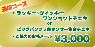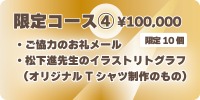限定コース②は、登録したメールアドレスに後日『お礼のメール』と、オリジナルTシャツ(サイズ選択可能、色指定不可)、サイン色紙(ラッキー、ヴィッキー、松下先生の3枚全て)。そして限定特典として、次回開催予定のビッグバンプラ座公演ライブのペアチケットをリターン品としてお送りします。