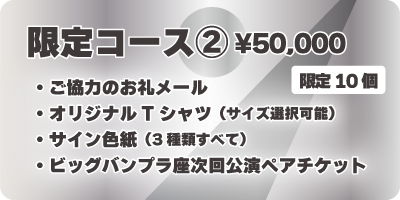限定コース①は、登録したメールアドレスに後日『お礼のメール』と、オリジナルグッズ(トートバック、マグカップ、ハンドタオルの3種類のうち1個)。そして限定特典として、次回開催予定のビッグバンプラ座公演ライブのペアチケットをリターン品としてお送りします