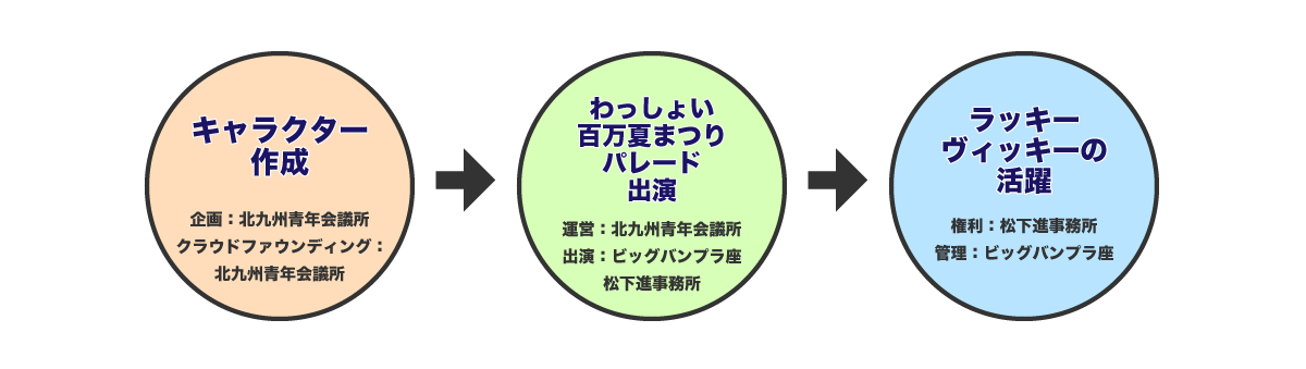 本年、北九州市が市制60周年を迎えるにあたり、かつて北九州市を盛り上げてくれた、ラッキー・ラビットとヴィッキー・ラビットの事を思い出し、もう一度彼らを地球へ招待して、毎年8月に開催される『わっしょい百万夏まつり』のパレードに参加し、市民の皆さまに笑顔になってもらいたいと思ったのがこのプロジェクトスタートのきっかけでした。