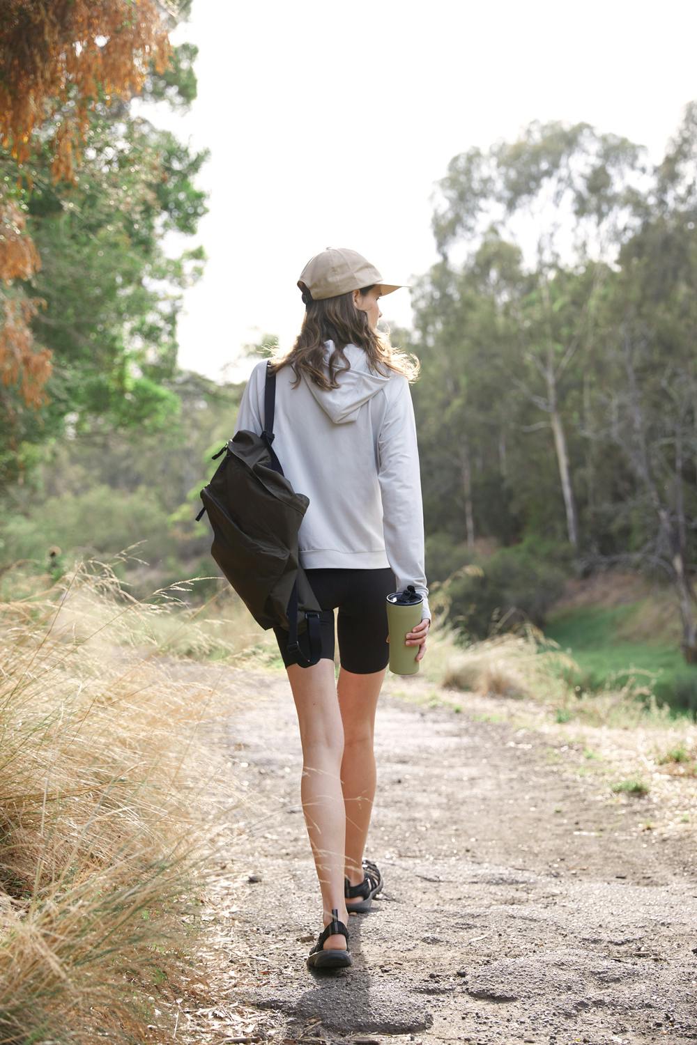 男女兼用で紐の長さも調整可能です。カラビナ部をベルトループに引掛けてポーチを固定でき、自転車移動や山歩きでも邪魔になりません。