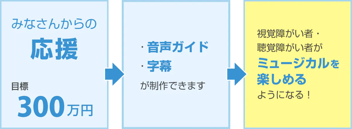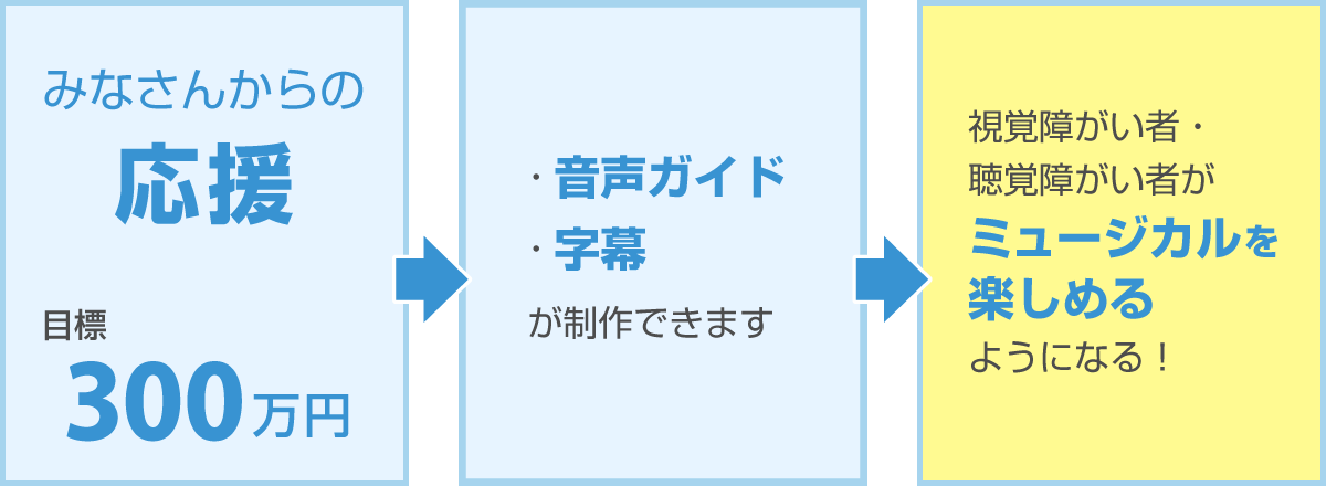 その「Musical For All ーあらゆるひとに参加と鑑賞の機会をー」の取り組みの最初のステップとして、見えない人、聞こえない人が、ミュージカルを鑑賞するために必要となる「音声ガイド」と「字幕」を制作します。