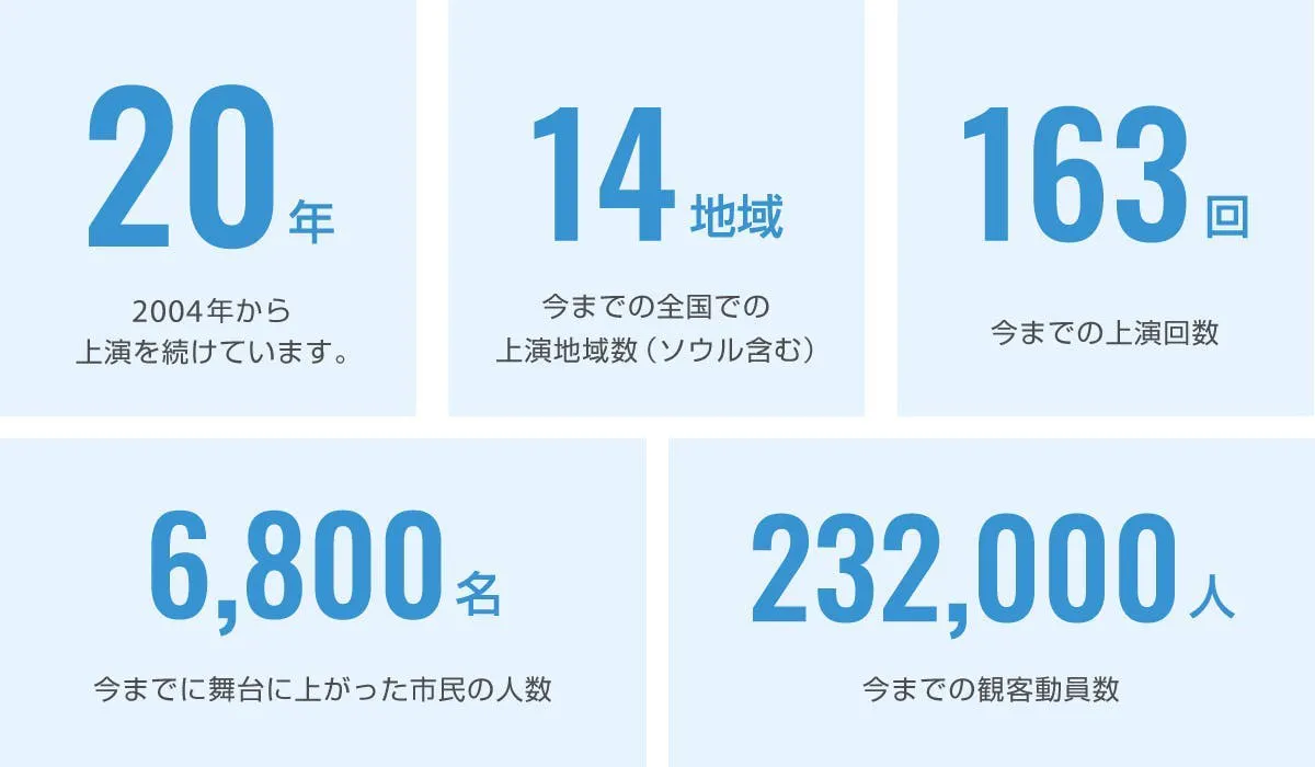 年齢や職業、国籍、性格や価値観、あらゆる違いを越えて集う市民キャストたち。彼らは、歌やダンスといった表現活動を通じて、ありのままの自分を受け入れると同時に、異なる他者を受容していくプロセスを歩みます。