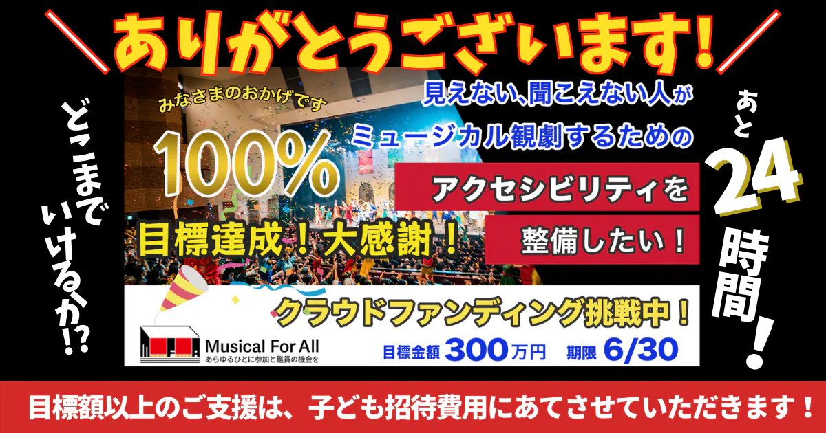 2023/07/04 10:08おはようございます!コモンビート代表の安達です。6月30日(金)23:59にクラウドファンディング「見えない・聞こえない人がミュージカル観劇するためのアクセシビリティを整備したい!」が終了しました。350人から3,216,111円をご支援いただき、無事に成功となりました!応援をいただいたみなさま、本当にありがとうございました!!このクラウドファンディングにより、字幕と音声ガイドを制作する費用がまかなえることとなり、「Musical For All ーあらゆるひとに参加と鑑賞の機会をー」のプロジェクトとしてもはじめの一歩を踏み出すことができるようになります。音声ガイドや字幕があることで、見えない人、見えづらい人、聞こえない人、聞こえづらい人をコモンビートのミュージカルにウェルカムする準備がようやく整います。これを整えればご来場いただけるということではなく、あくまでも土台が整ったということですね。海外の映画に日本語字幕があたりまえについているように、ようやく彼らにとってのアクセシビリティが整ったということです。今後はさらにこのミュージカルを観てもらえるように、情報提供の仕方にも工夫をして、彼らに情報が届くように仕掛けていきます。8月の東京公演が、字幕・音声ガイドを実装する初めての公演となります。ぜひご来場いただき、より多様な人が来場する会場や多様な観劇の仕方がある客席の雰囲気を感じていただければと思います。ぜひチケットをお買い求めください!(→公演情報・チケット販売サイト)みなさまのおかげではじめの一歩を踏み出すことができましたが、Musical For All の挑戦はまだまだ続きます。このクラウドファンディングに続いて、7月下旬から8月にかけて(期間調整中)、マンスリーファンディングを立ち上げて、子どもたちの招待費用をまかなうための資金調達キャンペーンを行う予定です。未来を担う子どもたちに心に響く舞台を届けていければと思っています。お願いばかりで恐縮ですが、あらゆるひとにミュージカル「A COMMON BEAT」への参加と鑑賞の機会を届けるために応援いただければ幸いです!改めまして、クラウドファンディング「見えない・聞こえない人がミュージカル観劇するためのアクセシビリティを整備したい!」に応援をいただき、ありがとうございました!NPO法人コモンビート理事長 安達亮 もっと見る