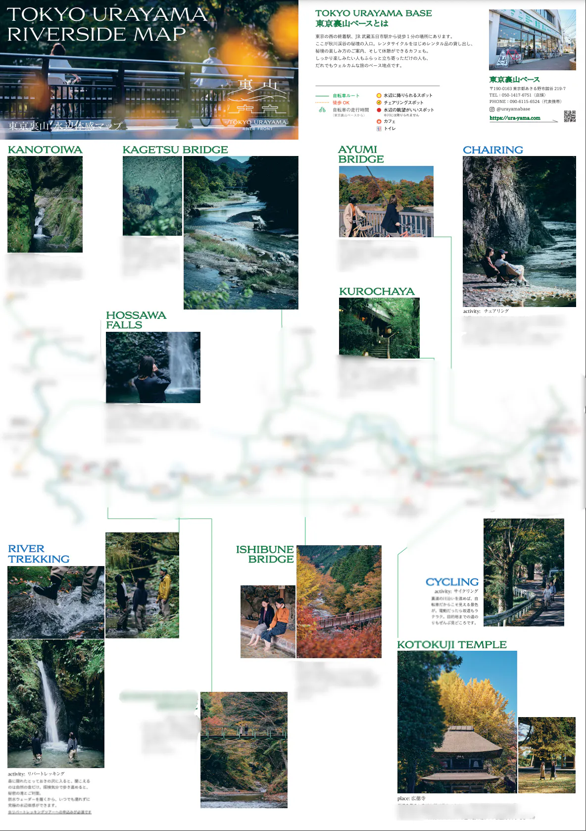 (※)この地域でツアー実績を重ねてきた東京裏山ベースが、おすすめスポットを厳選した特製マップを製作中。「東京渓谷サイクリング」またはレンタサイクル利用とセットで無料提供します。秋川渓谷の水辺空間が一覧でき、川と地域の全体像が把握できます!わかりにくい川への降り口もピンポイントでご案内。おすすめ立ち寄りスポットやビュースポット、自転車旅の合間に休憩できるカフェ情報も厳選して掲載しています。