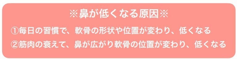 →鼻の高さは骨ではなく、『軟骨』と『筋肉』によって変化していきます!これを解決するには、軟骨の位置の修正と鼻の筋肉の筋トレです!