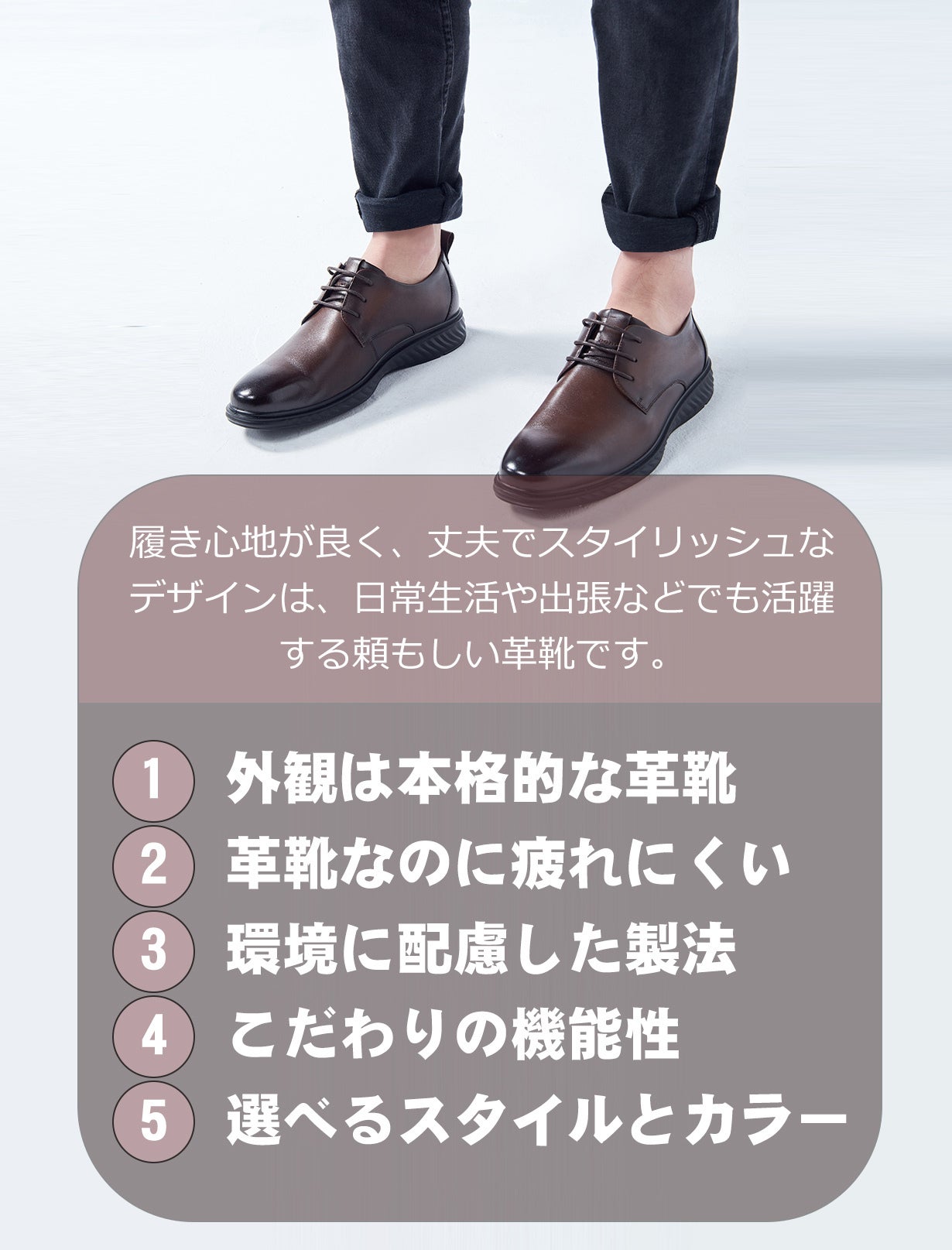 「ビジネス」な見た目ながら、「履き心地」を重視した全ての方に満足していてもらえる靴を目指しました。アッパーには牛のトップレザーを使用し、革靴ならではのフォーマルさを演出しながら、軽快な履き心地でスニーカーのよう快適さをも備えています。