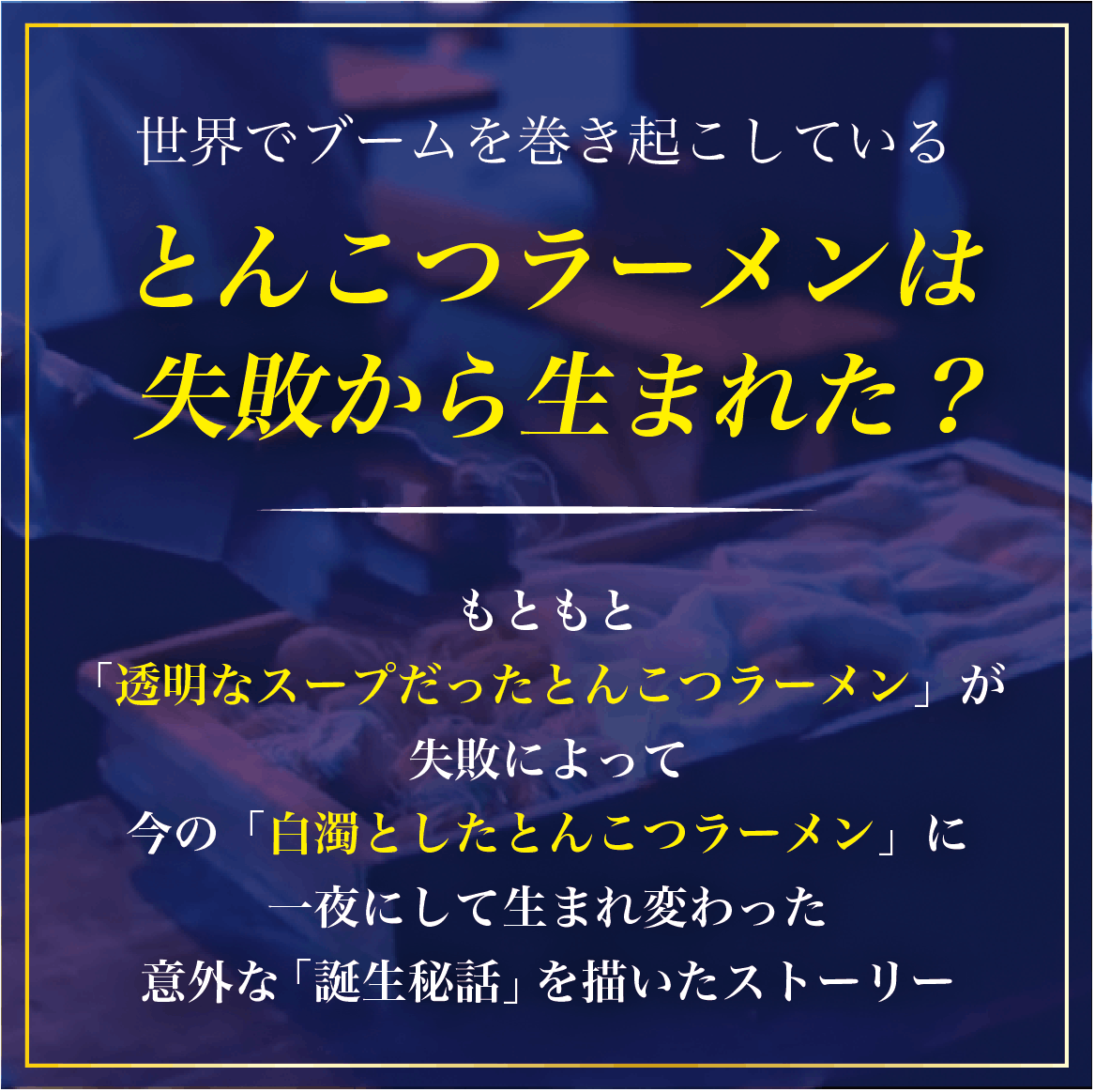 この映画は、【失敗から生まれたとんこつラーメンの誕生秘話】を描いている唯一の作品です。そして、昭和の古き良き日本の情緒を、現代の視点から斬新に描き出し、世界の若い層に響くストーリーになっています。
