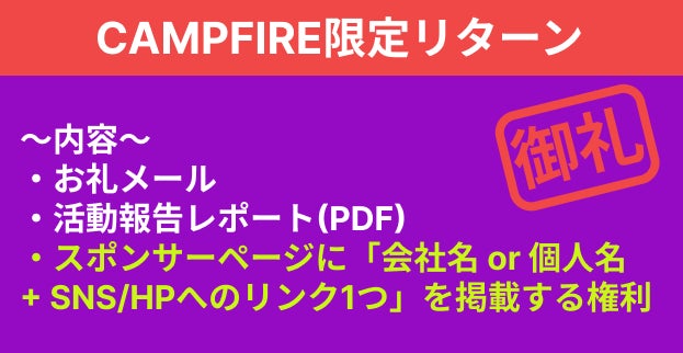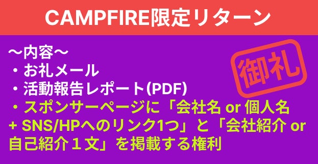本プロジェクトはAll-or-Nothing方式で実施します。目標金額に満たない場合、計画の実行及びリターンのお届けはございません。