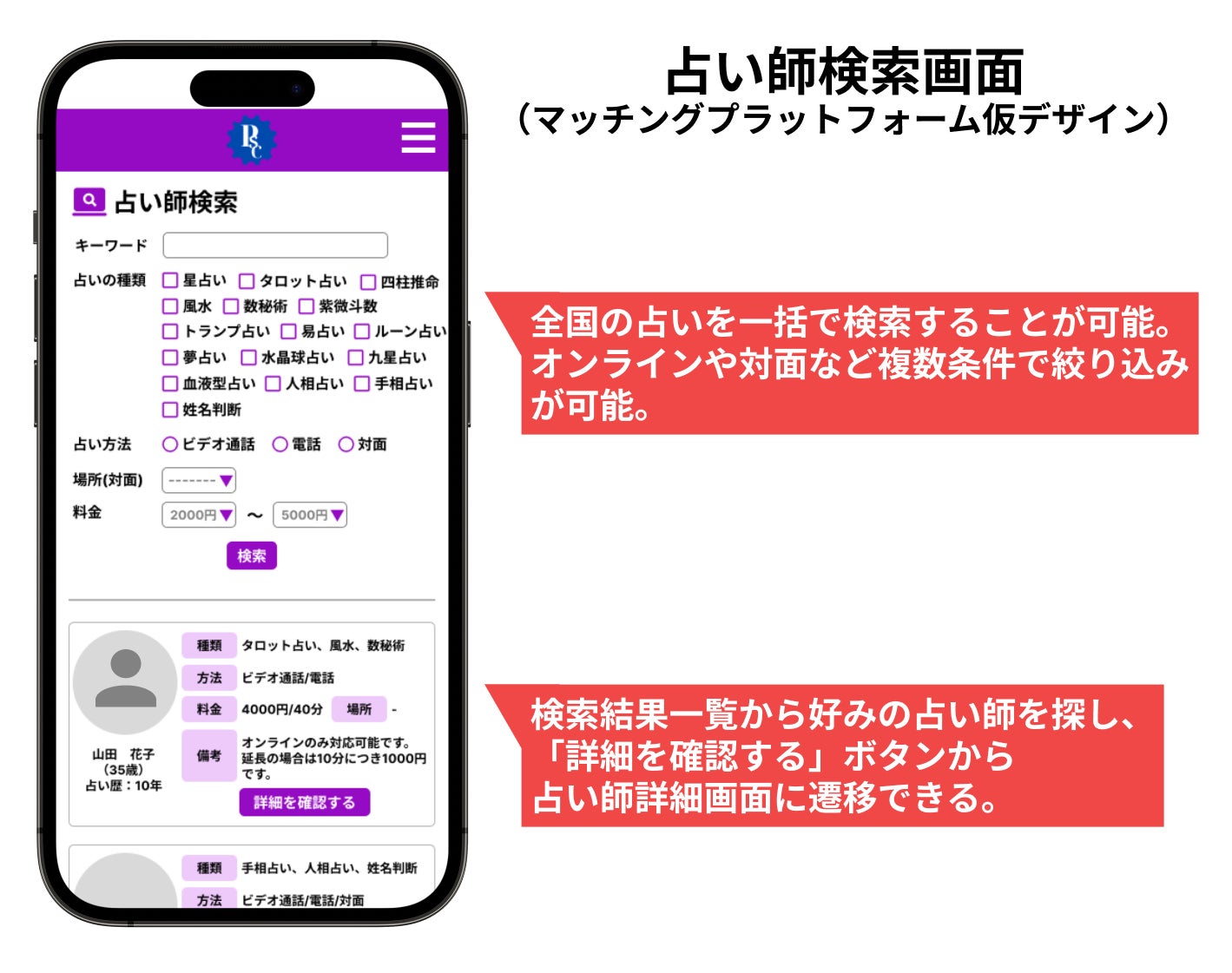 今回のプロジェクトでは、マージン・紹介手数料を取らずに上記のデメリットや制約はなるべく少なくしつつも、占い利用者は全国の占い師から比較検討ができたり、たくさんの占い師から条件を絞り込んで検索し、オンライン/オフラインで占いを受ける機能などの利便性はきちんと有しているマッチングプラットフォームを構築します。