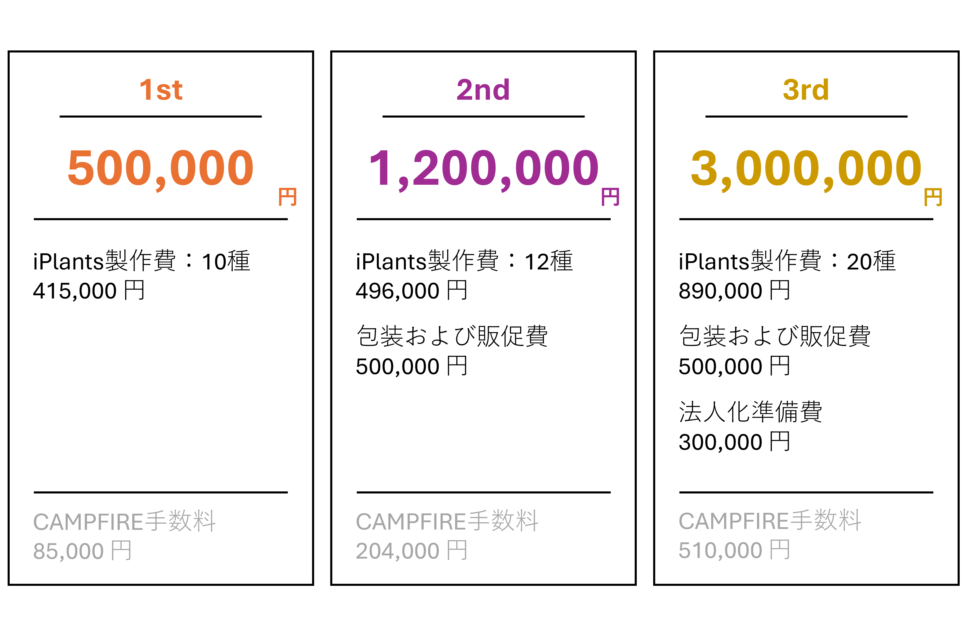 今回のクラウドファンディングでは3つのゴールを設けます。1stゴールは500,000円です。1種の植物をiPlantsにするためには撮影費とトリミング加工費で40,000円の費用が必要ですので、手数料を除いた資金で新たに10種をiPlantsにすることができます。2ndゴールは1,200,000円です。iPlantsにする種数を増やすとともに、iPlantsを使った魅力的な商品を作るための費用に充てさせていただきます。そして、3rdゴールは3,000,000円です。さらに種数を増やせるとともに、2ndゴール同様、商品を作るための費用に充てます。また、3rdゴールを達成するほど反響があるということは需要アリと見込めるため、法人化するための費用に充てさせていただこうと考えています。