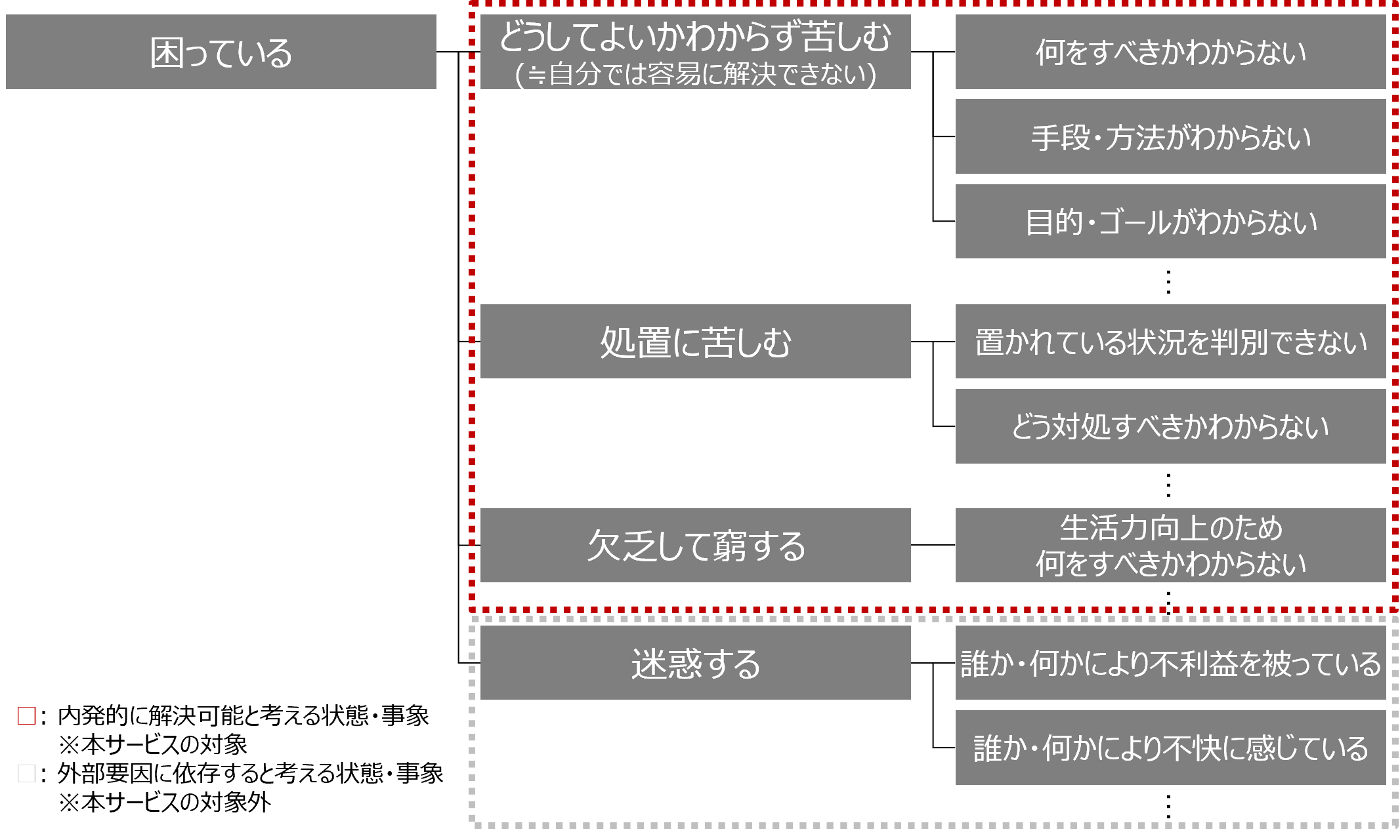 何かに困っている方全般を対象としておりますが、一言に”困っている”といっても、解決の手立てとして内発的に解決可能か、外部要因に依存するかによって解決策も異なります。