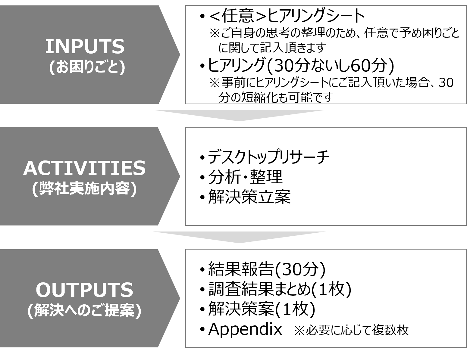 簡易的な調査(デスクトップ調査)、解決策案、およびご報告がリターンとなります。
