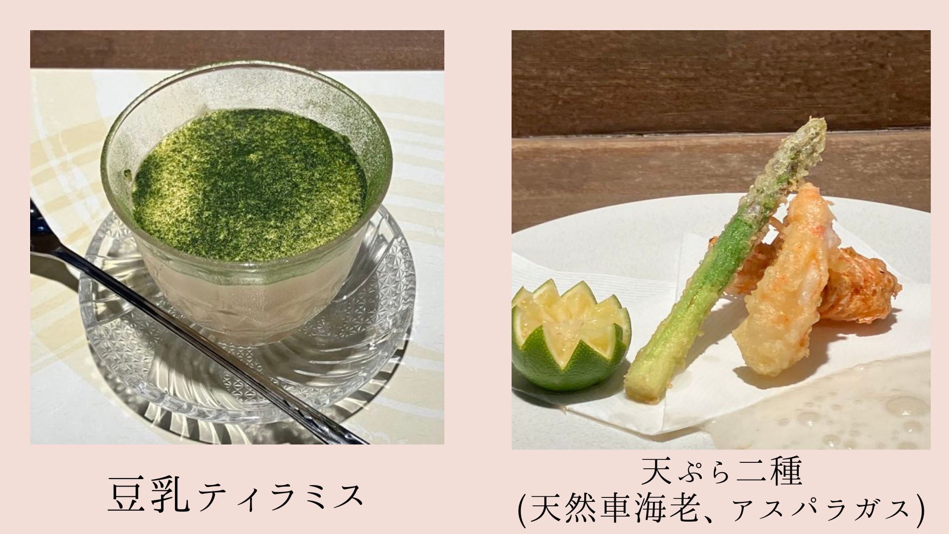 こちらは定番のえびの天ぷらですが、見た目にも楽しんでいただける飾り付けや、食材に合うさまざまな塩をご用意してお待ちしております!