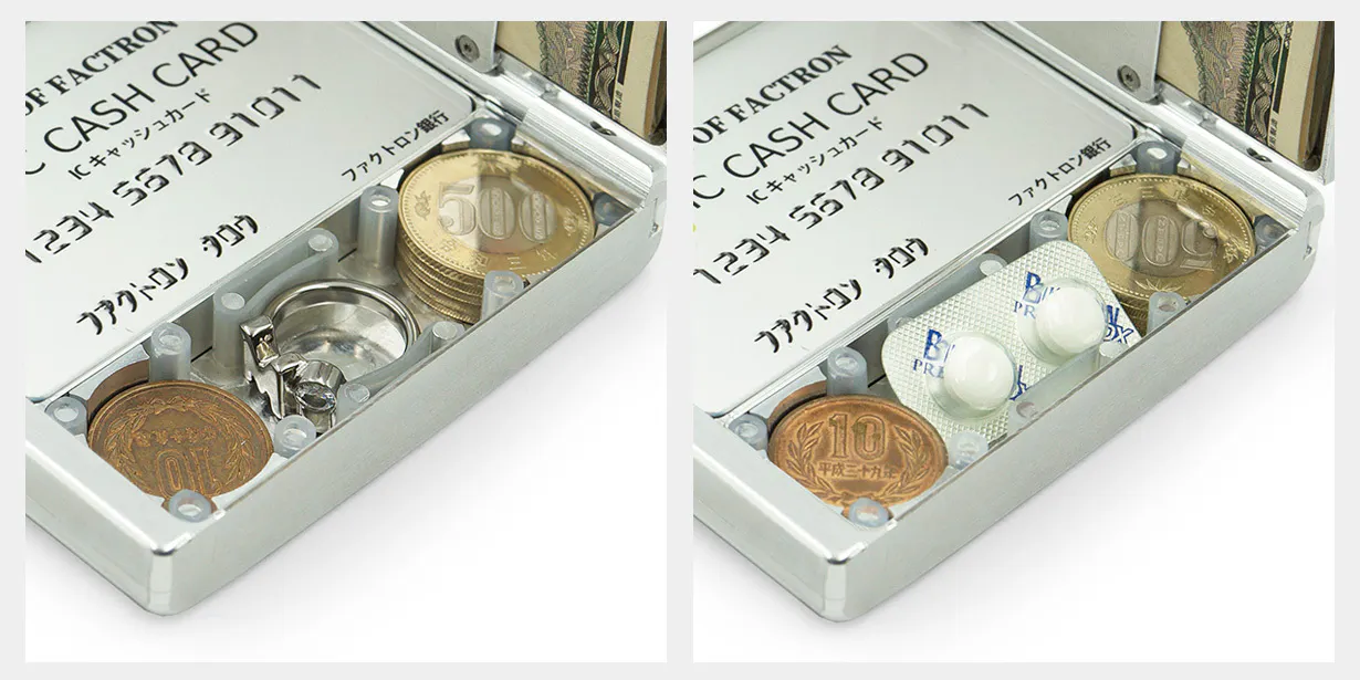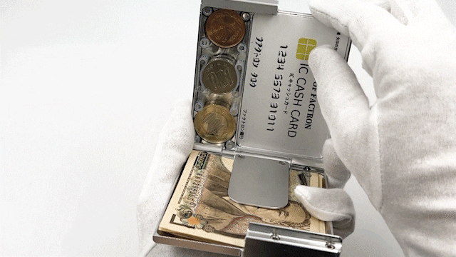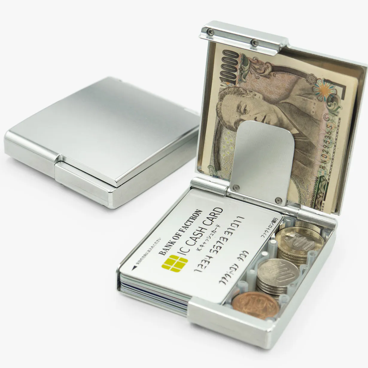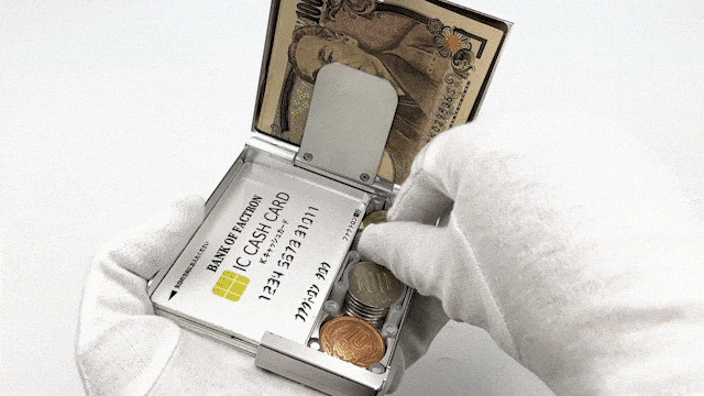 市場にある既存のメタル製クレジットカードケースは、金属板とゴムでカードを挟み込むタイプや、カードをレバーなどで押し出すタイプのものなどが主流です。マネークリップ付きの商品もありますが、それらは全てカードの収納がメインです。そこから利便性や必要性など様々な分析をし、「お札もコインも入るコンパクトなクレジットカードケース」という結論に達し、開発に着手しました。