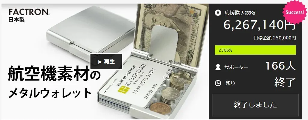 • FACTRONのメタルウォレットBoxyプロジェクト中には、沢山の皆様からの温かいご支援をいただきました。皆様からのご支援はFACTRONのものづくりの大きな力となっております。心より感謝申し上げます。さて弊社は昨日より、新たなプロジェクトをスタートいたしました。メタルウォレットと同じ航空機素材を削り出して製作した、手の平に収まるコインケースです。このコインケースは、FACTRONの大ヒットモデルの改良版になります。メタルウォレットをご支援いただいた皆様には、ぜひご覧いただきたいアイテムです。https://camp-fire.jp/projects/898924/view今後とも、何卒よろしくお願い申し上げます。 もっと見る