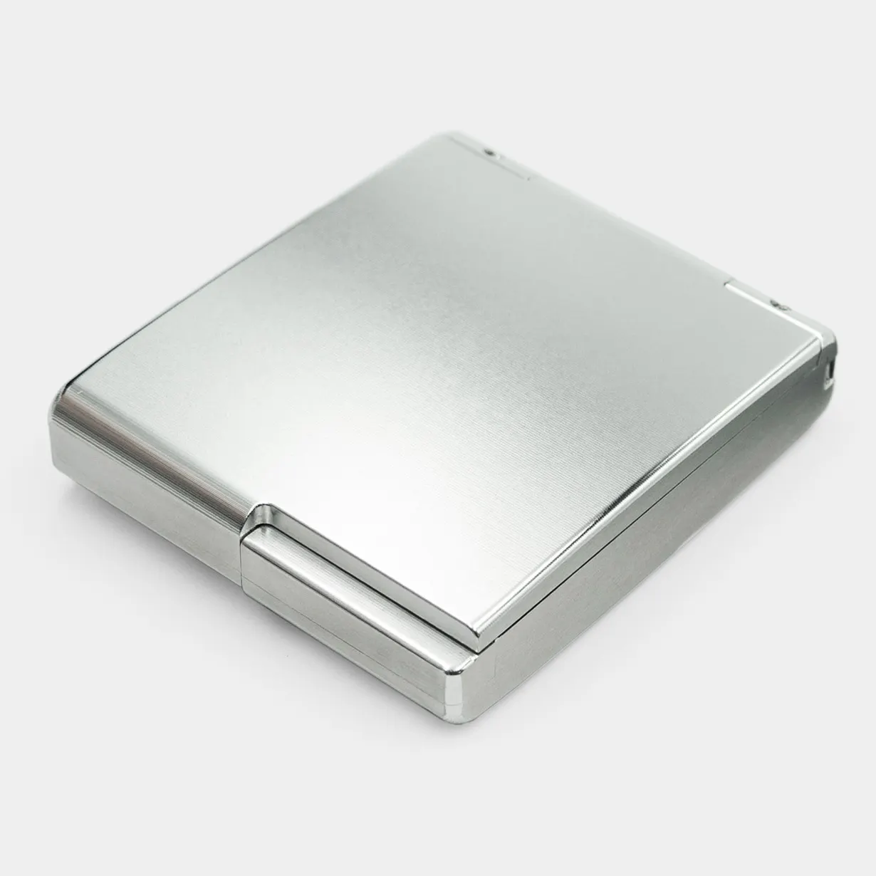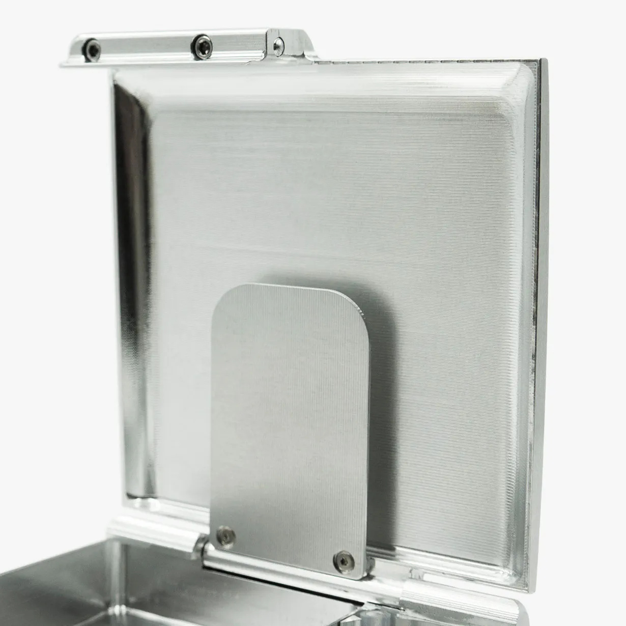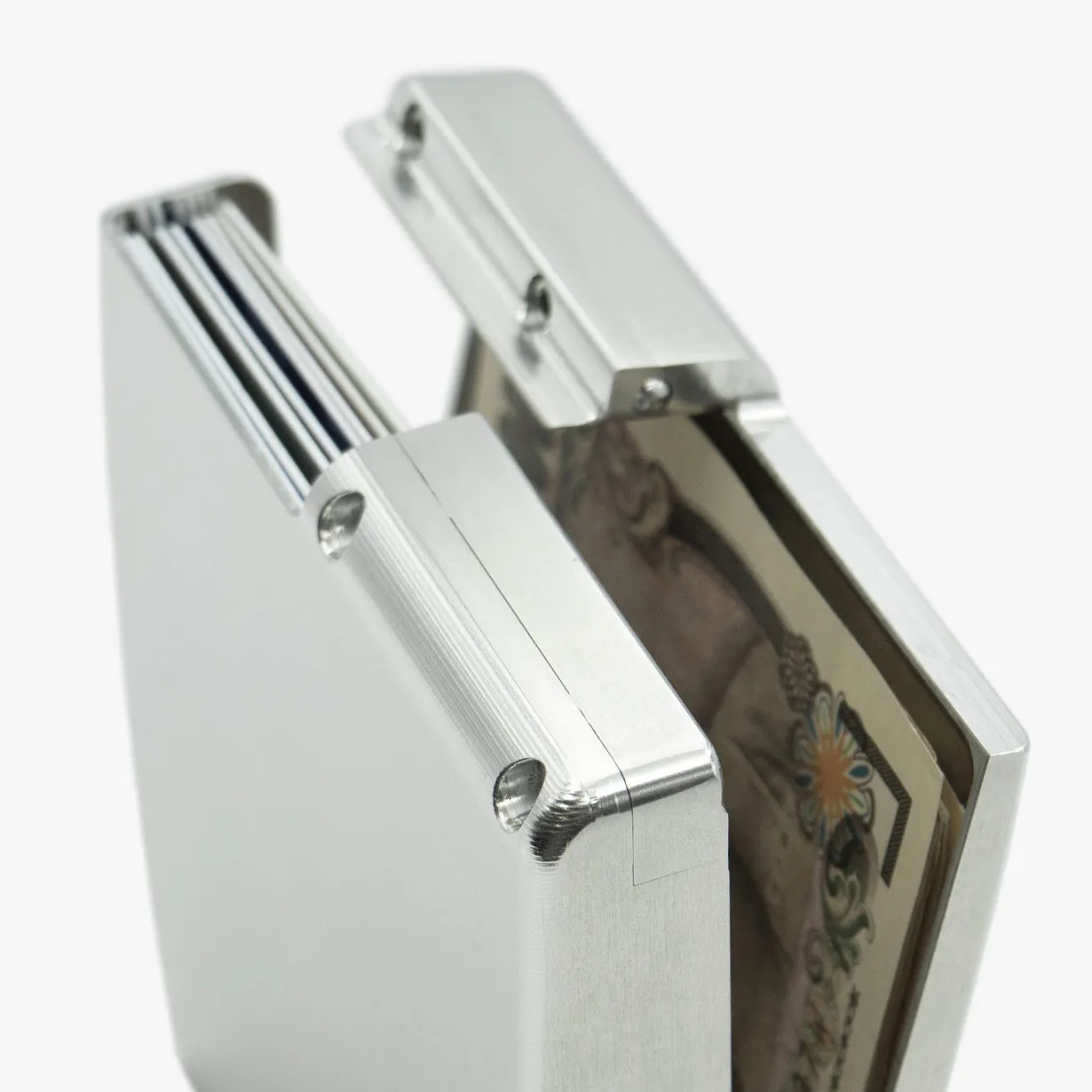 スキミング防止。航空機素材のウォレットに、カードや二つ折り紙幣、コインをスマート収納します。お会計シーンを格上げするデザインと、ボトムの前ポケットにも入るコンパクト設計(意匠登録済)。オーダーメイドでひとつひとつ金属の塊から削り出し加工で製造し、手仕事で仕上げる滑らかな手触りです。