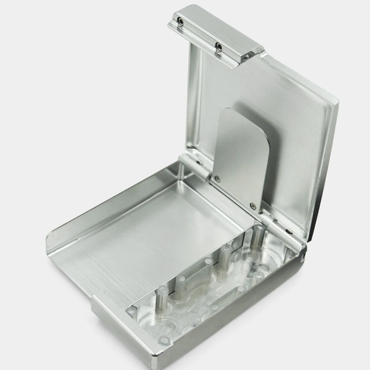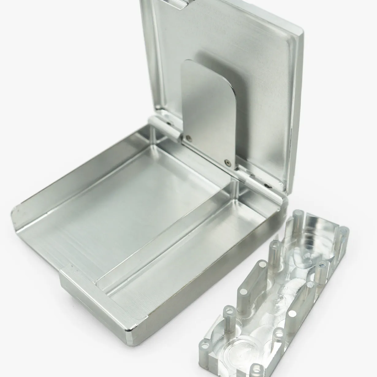 メタルウォレットBoxyのジュラルミンモデルは、無垢の材料から一つ一つのパーツの状態になるまで、1セットで10時間43分かけて3次元削り出し加工をします。