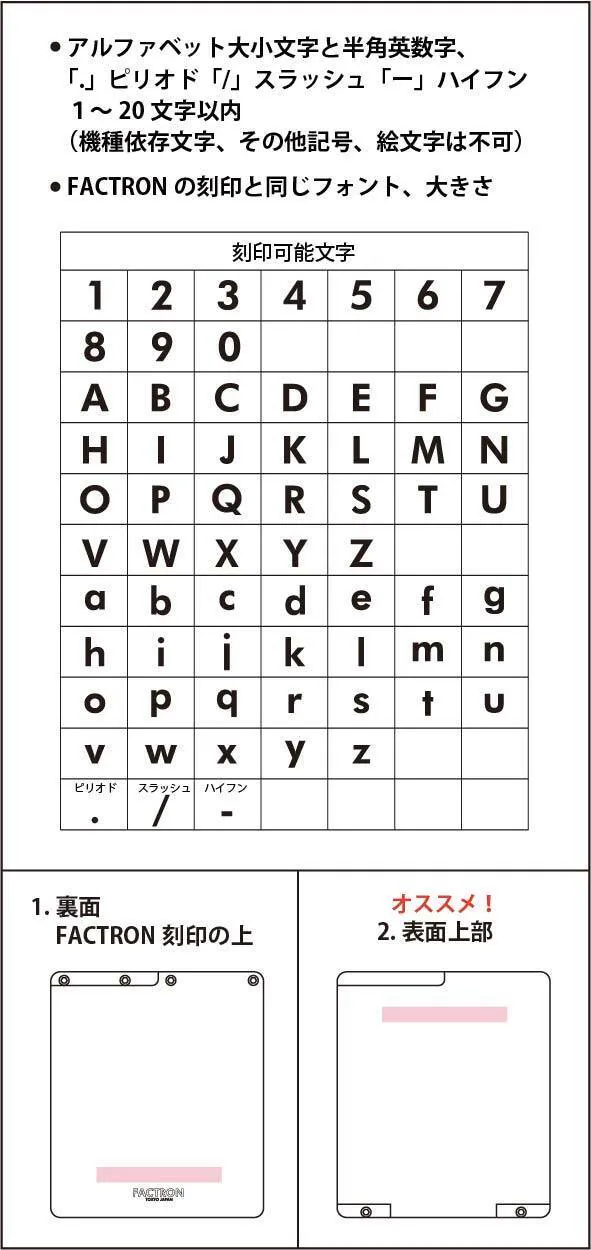 オプションの文字刻印で「1.裏面FACTRON刻印の上」をご希望の場合は、エディションナンバーの上部に刻印します。