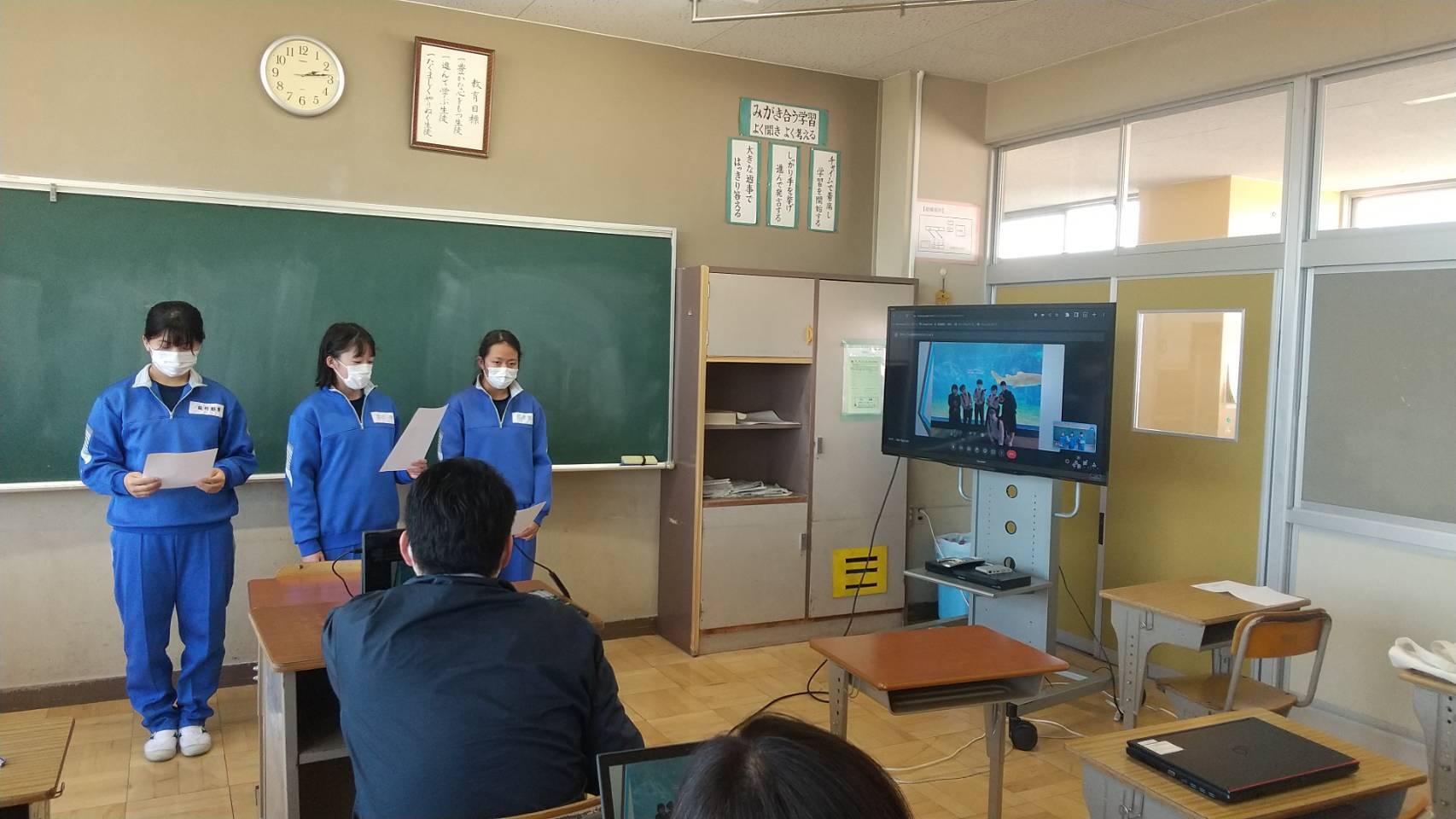 ・周りの環境が違っていても、鏡原中との共通点を見つけたり、鏡原中にはあって北中にはないことを知ったりすることがとても楽しかった。また、オンライン交流をすることがあったら、北中のこともたくさん教えられたらいいなと思った。