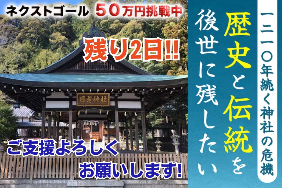2023/07/27 13:36こんにちは!いつも応援、アクセスありがとうございます。また、ご支援下さいました皆さまありがとうございます。クラウドファンディングも残すところあと3日を切ってしまいました。これまで多大なるご支援をいただき、ファーストゴール目標金額の30万円を達成することができ、現在ネクストゴールの50万円を目指し活動を継続中であります。日吉神社の存続のために、是非とも拡散頂き、更なるご支援を賜れますと幸いです。 残り3日まだまだネクストゴールに向かってあきらめず頑張りますので、引き続きご支援・応援・拡散をよろしくお願いいたします!!! もっと見る