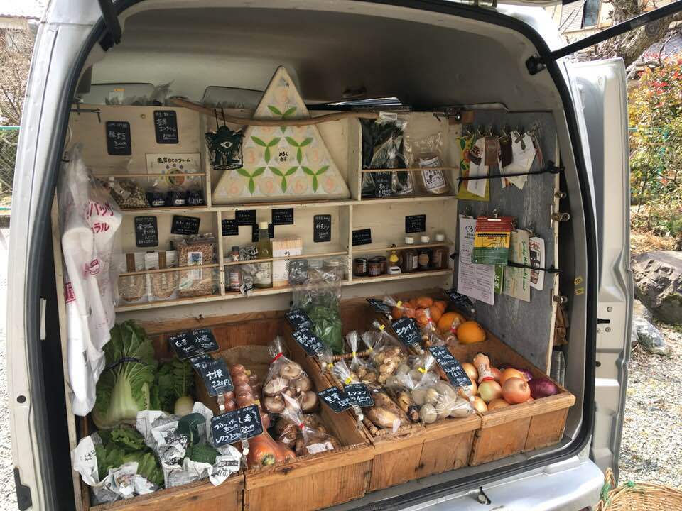 軽バンの後ろに店舗スペースを設けて週に一回、決まった場所で販売して回りつつ、予約を受けた野菜セットを配達してお届けします。