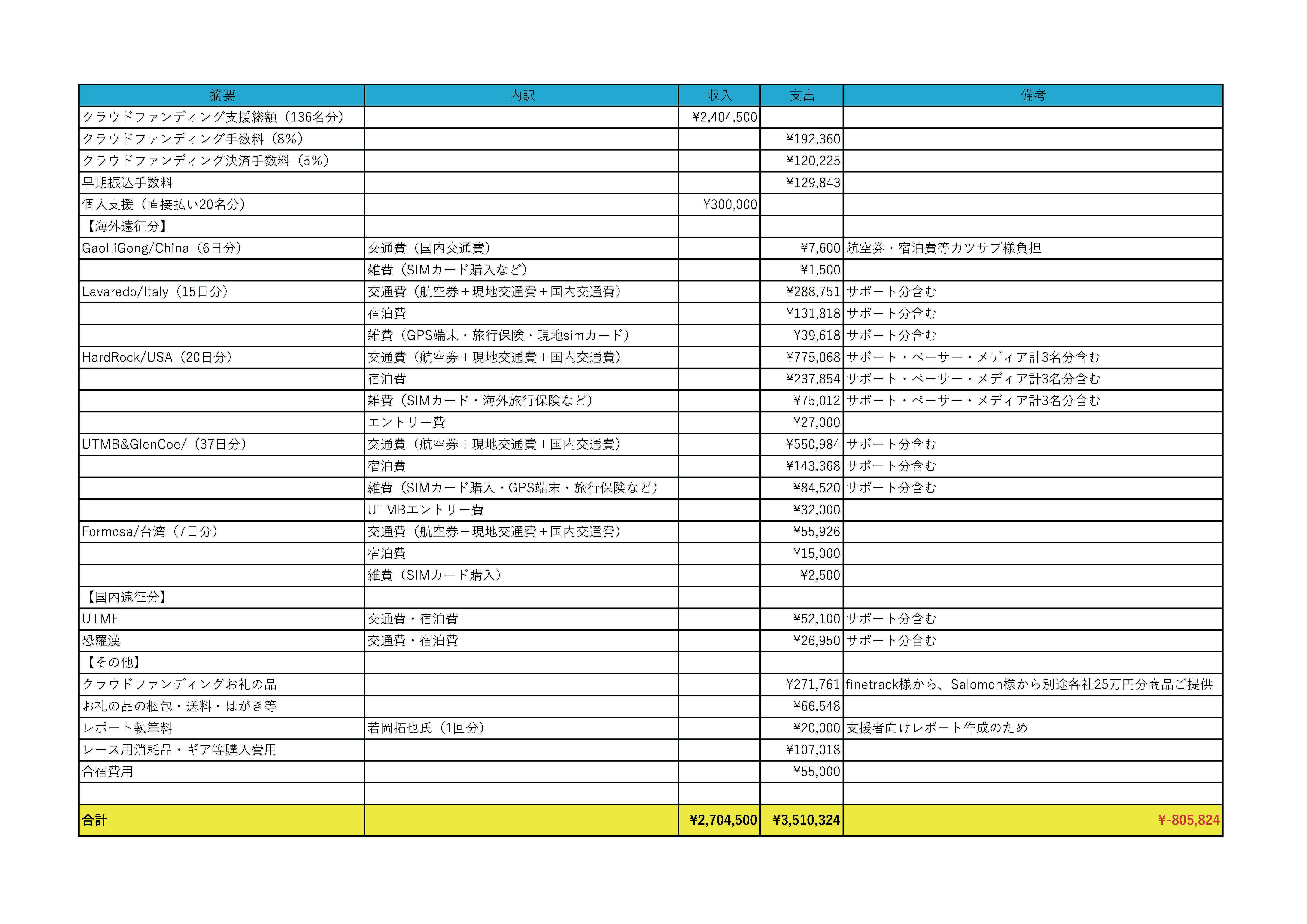 2019/02/01 09:50大変遅くなってしまいましたが、ご支援くださった皆様に収支報告させていただきます。大変多くのご支援を頂くことが出来たため、早めに現地入りしてコースの試走や準備が出来たり、サポートを連れて行って、レース中のサポートをしてもらったりと、昨年の目標達成するために非常にプラスになりました。心からお礼申し上げます。長期滞在になるので、友人の家に泊めてもらったり、なるべく安い宿に宿泊して自炊したりとやりくりしましたが、それでもアメリカのシルバートンでは4WD無しではどこにも行けないため、長期でレンタカーを借りなければいけなかったり、イタリアでの軽油の高さが日本の2倍ぐらいだったりと、思った以上にお金がかかりました。皆様のお力添えがなかったら、絶対に達成できなかった結果です。収支は最終的にマイナスになっておりますが、昨年クラウドファンディングとは別にサポートいただいた各メーカー様のお力添えにより、トントンぐらいで終えることが出来ました。トレイルランニングというマイナースポーツでありながら、日本選手の世界挑戦のためにご支援くださるメーカーや企業の皆様に心から感謝を申し上げます。クラウドファンディング:もりや眼科・神戸マッチ株式会社・あしラボ・針中野フィジカルケア年間契約スポンサー企業:株式会社アリスト(メダリスト)・スタミナ・スポーツ株式会社(カツサプ)・Salomon・finetrack今年は更に大きなエキサイティングな目標に向かってチャレンジして参りたいと思います。現在徐々にFBで今年のレース計画を発表していますが、まだ全てが確定していないため、3月頃には新たなチャレンジの発表と、その資金調達のためのクラウドファンディングを開始させていただく予定です。またレポートなどで皆様とその感動を共有できるよう頑張りますので、皆様のお力添えをいただければ幸いです。 もっと見る