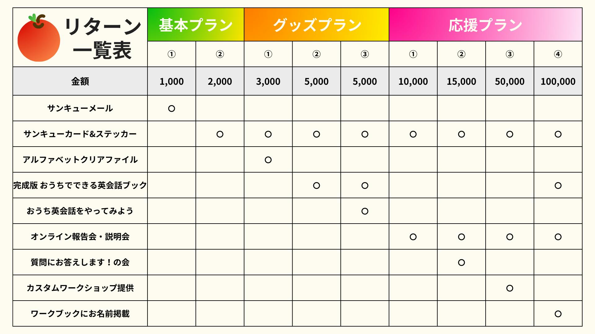 リターンは、基本プラン・グッズプラン・応援プランの3種類に分かれており、全9種類展開となっています。