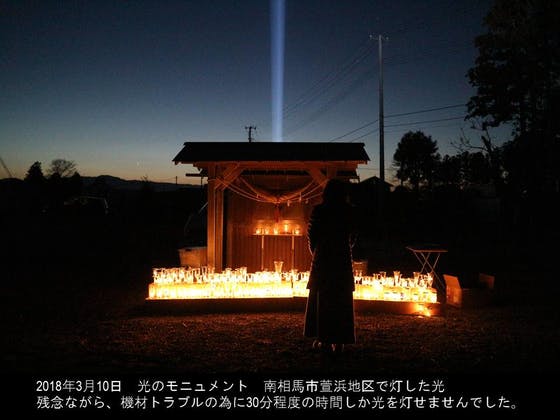 今年3月10~12日に3日間、5台のアークライト(サーチライト)を使用して「南相馬 光のモニュメント」というイベントを開催させて頂きました。本来なら助成金を取ったり、もっと早くクラウドファンディングを始めて資金を調達したいと考えていましたが、いろいろあってそれは叶いませんでした。今回は自腹も覚悟でやるしかないと思っていたところで、キャンプファイヤーさんのサイトを見つけて、改めて・All-In 方式でプロジェクトの不足分の資金を集める機会を得ました。皆さんのご協力を心よりお待ちしています。