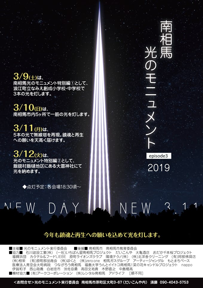 2019/03/04 15:18光のモニュメント2018へご支援頂きました皆様へこんにちは。だいぶ時間が掛かってしまいましたが、ようやく動画が完成し、正式に音源の使用許可も下りました。ご確認下さい。https://youtu.be/gvqKMfIuYA4今年は3月9日、浪江町立なみえ創成小学校・中学校3月10日、南相馬市内5ヶ所 ①南相馬市小高区大富地区滝平の里から精霊の木へ向けて光を灯します。 ②南相馬市小高区同慶寺 ③南相馬市原町区萱浜 綿津見神社 ④南相馬市鹿島区右田地区 御刀神社 ⑤南相馬市鹿島区南右田地区 風力発電3月11日は南相馬市 原町区 道の駅西側 高見公園そして、3月12日は飯舘村 飯樋地区 大雷神社神社にて光を灯すことになりました。昨年、皆様から頂きました暖かいご支援に感謝し、次へつなげたいと思います。また、動画の完成が大幅に遅れましたことお詫び申し上げます。今後とも、光のモニュメントへ暖かいご支援よろしくお願いします。光のモニュメント実行委員会須藤 栄治※今年の記念誌をイベント終了後、皆様のところへ送らせて頂きます。 もっと見る