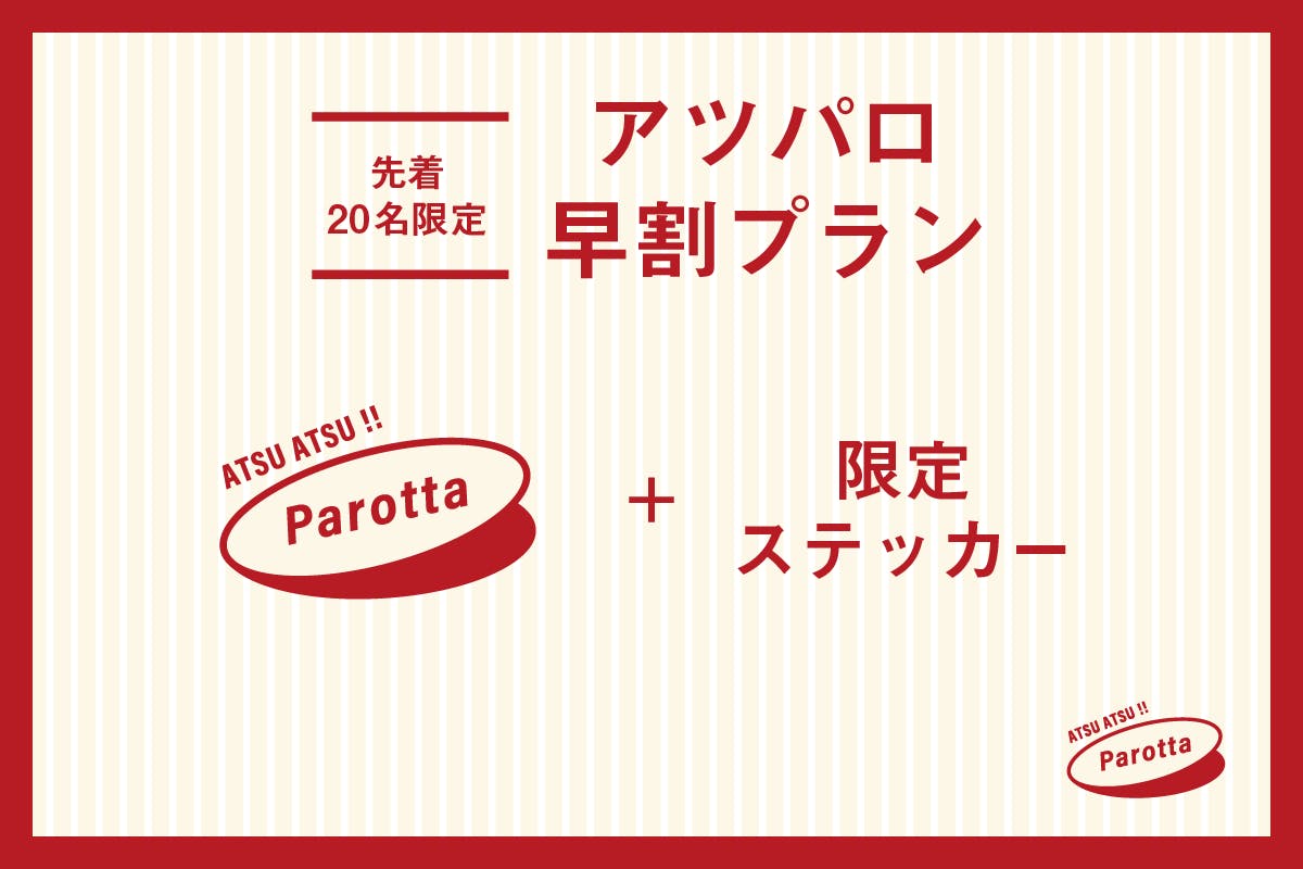 先着20名様限定。割引き価格で ATSU ATSU!! Parotta と「どのインドパンが来るかお楽しみな限定ステッカー」をお届けします。