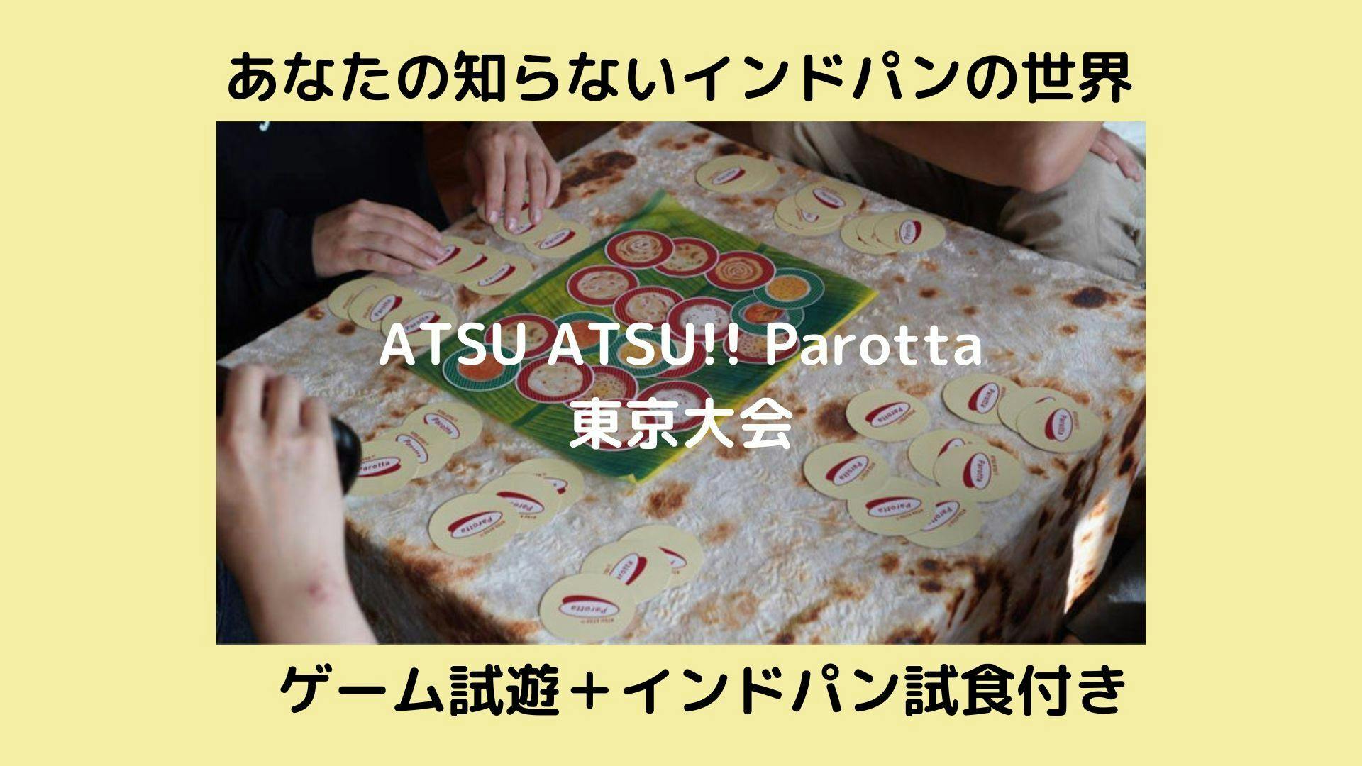 2023/08/16 16:07「ATSU ATSU !! Parotta」完成を記念して、全国で大会を開催していきます!初めての大会は9月3日に東京で開催します。ルール説明とデモンストレーションの後に、公式ルールでトーナメント戦を行い、優勝者には素敵なアツパログッズをプレゼントします。さらに、当日はゲームに登場するインドパンとカレーを提供します!あなたの知らないインドパンの世界をぜひ体感してみてください。目指せ東京最強のインドパンマスター!!参加申し込みはこちらのgoogleformからお願いします。https://forms.gle/8aQzM36pTHxz5Bq3A=====詳細=====料金:3,500円(大会参加+食事付き)ATSU ATSU !! Parottaを購入済みの方、及び当日購入いただいた方は500円引きになります。事前購入リンクはこちら。当日もご購入いただけます。https://philosophy-curry.booth.pm/items/4984678日時:9月3日(日)17時〜20時ごろ場所:Japanese Spice Curry wacca(東京都中央区八丁堀2丁目19-7 庄司ビル 1F)タイムスケジュール:17時〜試遊会&東京大会大会終了後18時頃〜ゲームに登場するインドパンとカレーの実食会があります。今後、9月9日(土)に京都大会、10月〜11月に名古屋・福岡大会を開催予定です。皆様にお会いできることを楽しみにしております!! もっと見るATSU ATSU !! Parottaの製造・梱包が完了しました。まもなく発送となります。