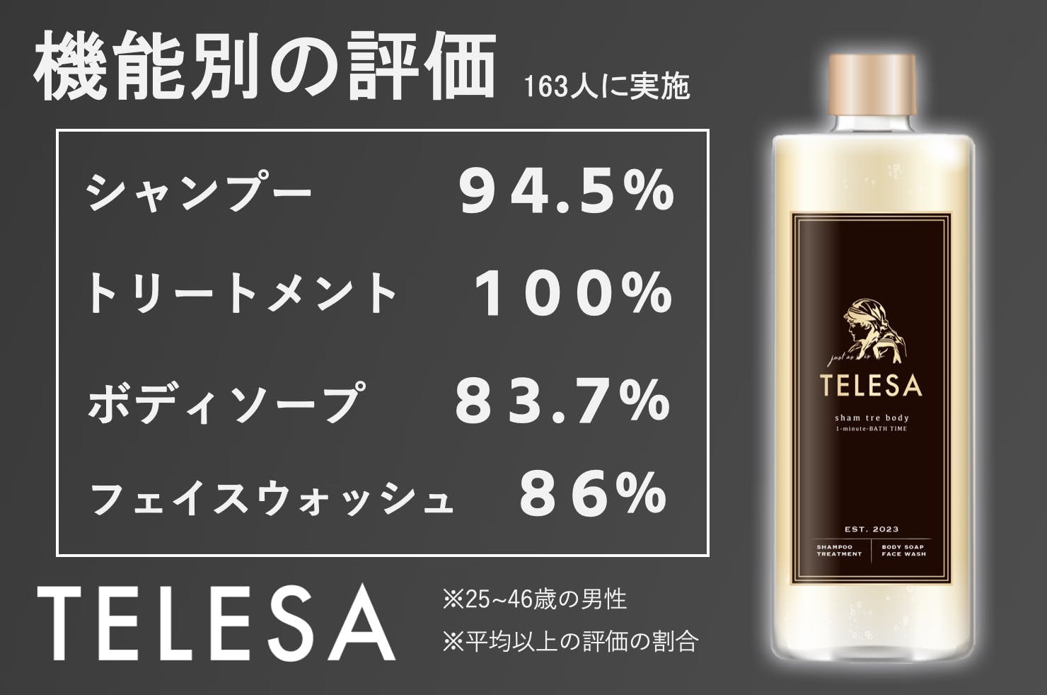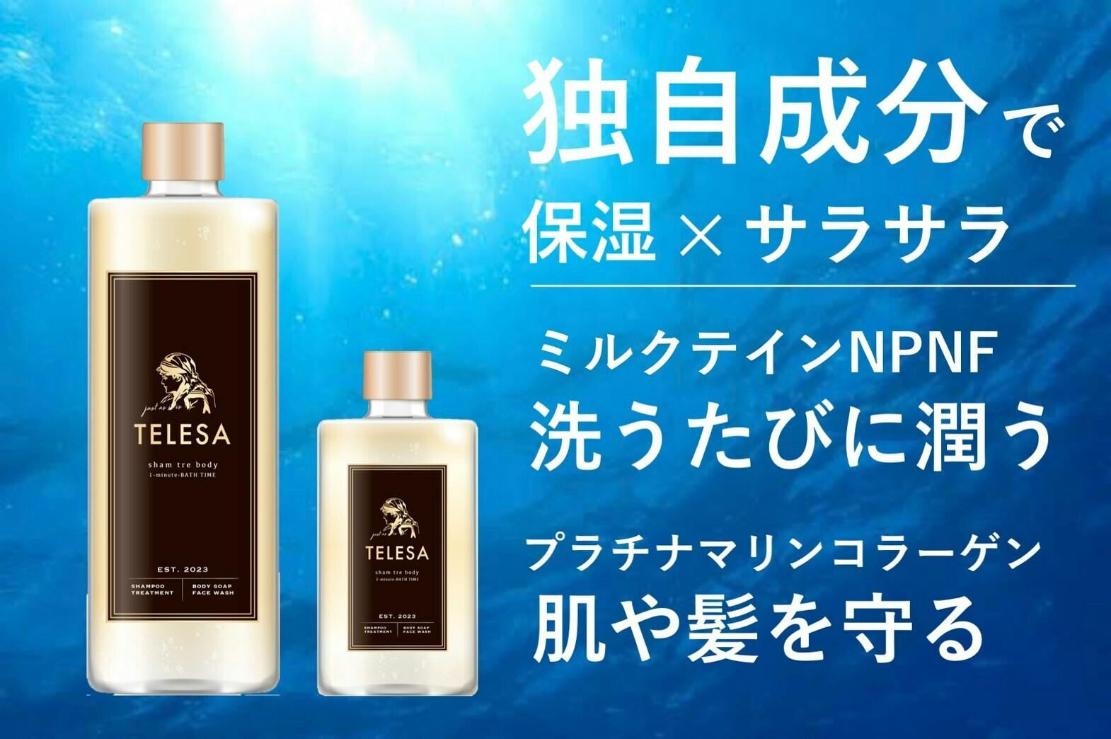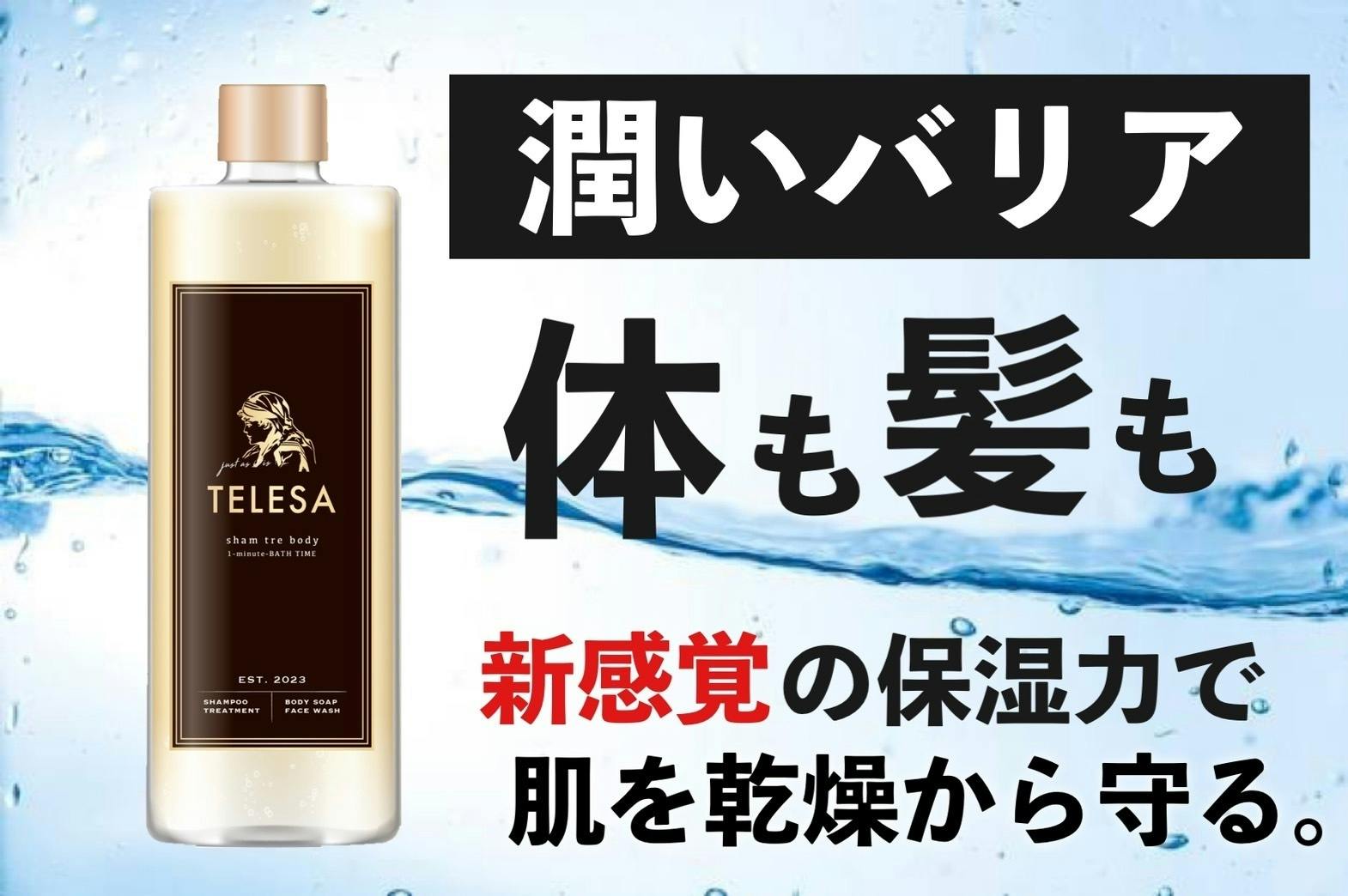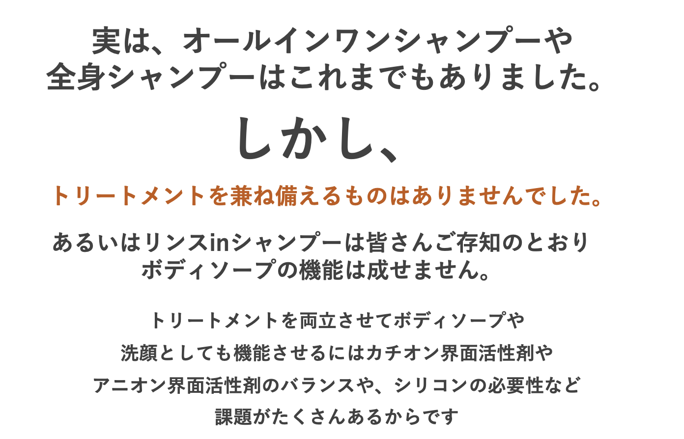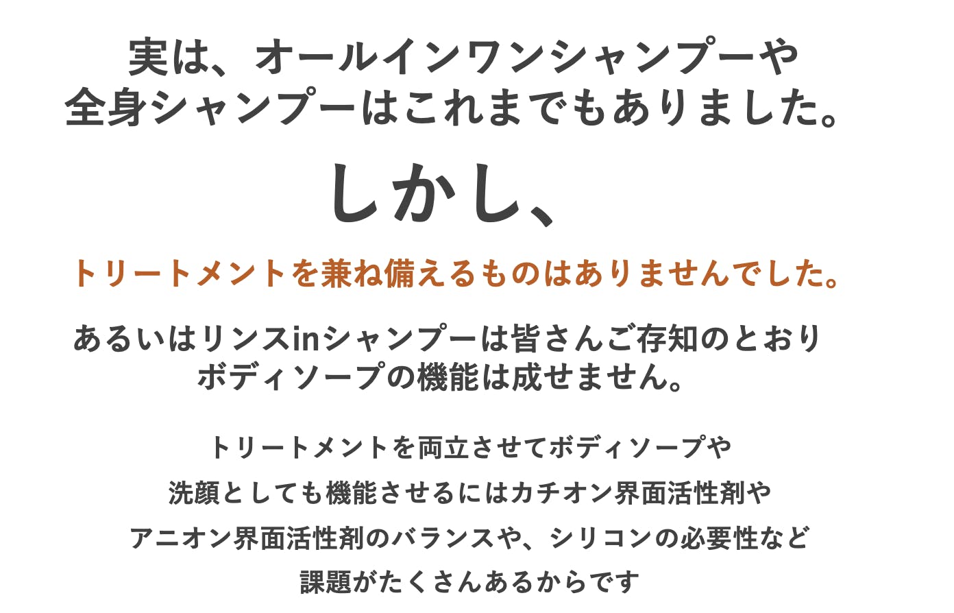ボディソープ:ボディソープとして、髪のトリートメント効果を付与すると体へはベタつきやヌメりが気になってしまうのを、ギリギリの処⽅でもっちり保湿はしつつタオルオフ後はサラサラする不思議な使⽤感を実現。肌を乾燥から守るため、カサつきが気にならなくなる。