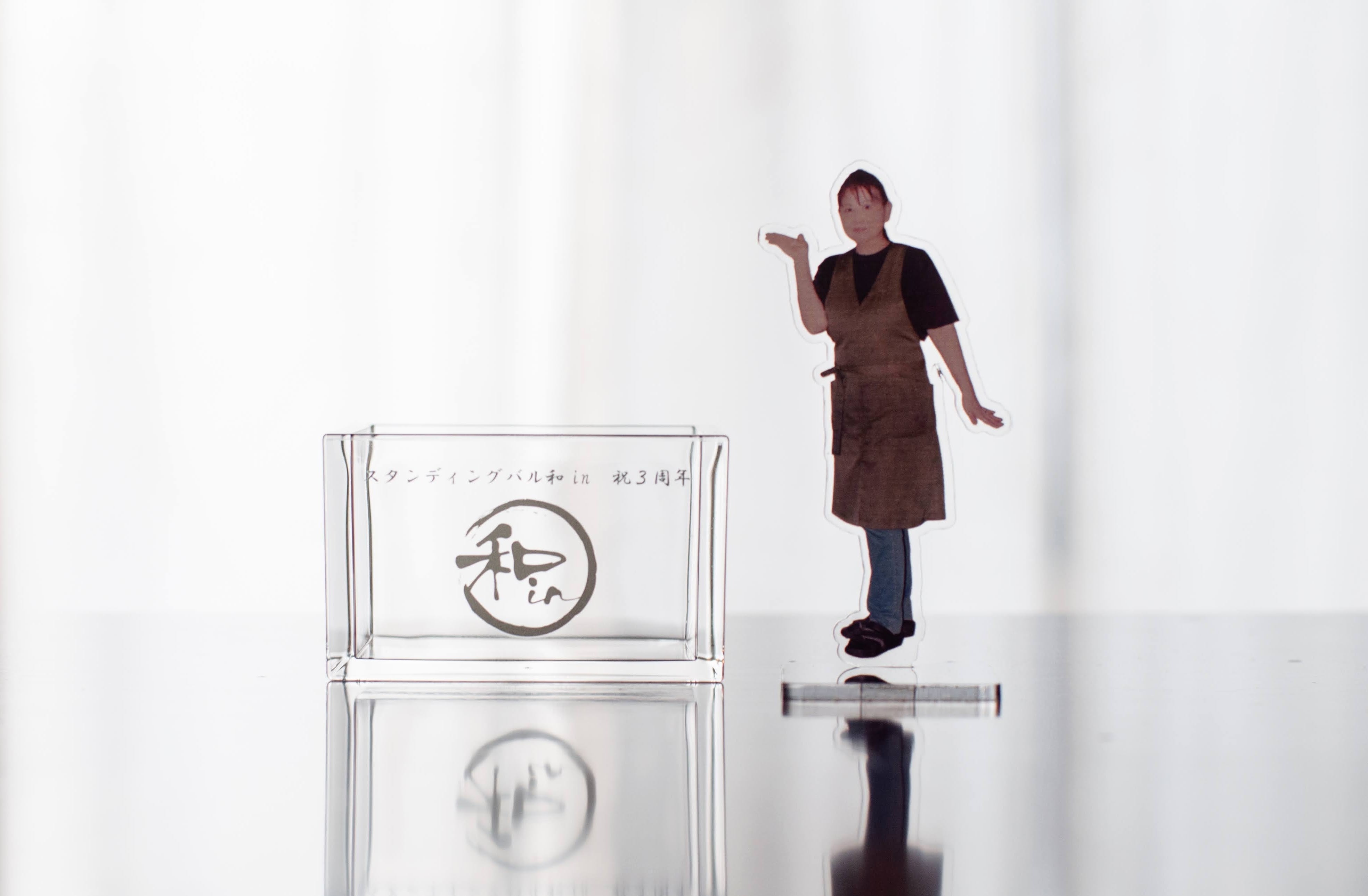 コロナ禍にカフェで導入した飛沫防止のパーテーションを再活用する試みとして、店主の写真でアクリルスタンド(以下、店主アクスタ)を試作しました。