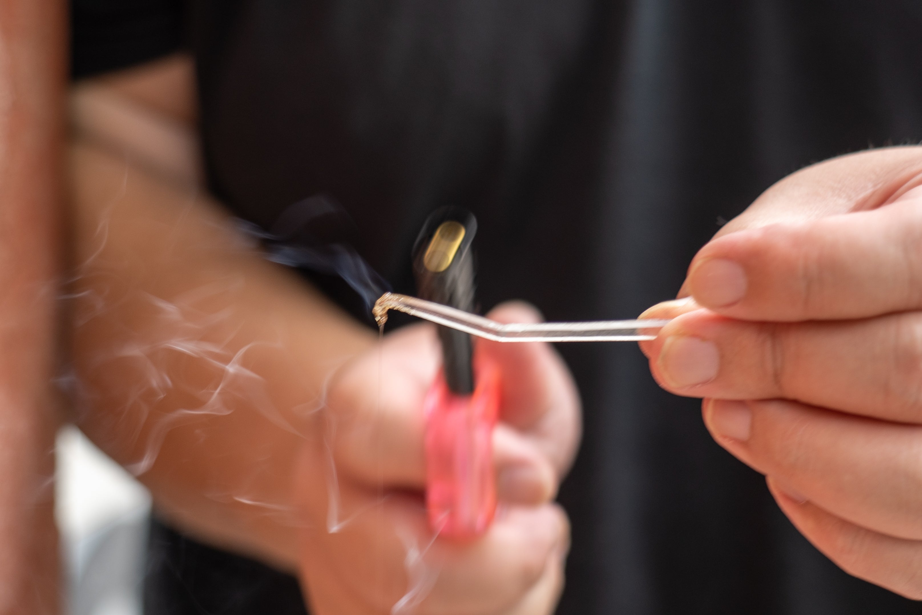 ところが、試作時にお店から回収してきたパーティションの中には、レーザーカッターでの加工に適さない「塩化ビニール製」が多くありました。火を近付けて溶けるものは「アクリル製」で、画像のように煙が出るものは「塩化ビニール製」です。