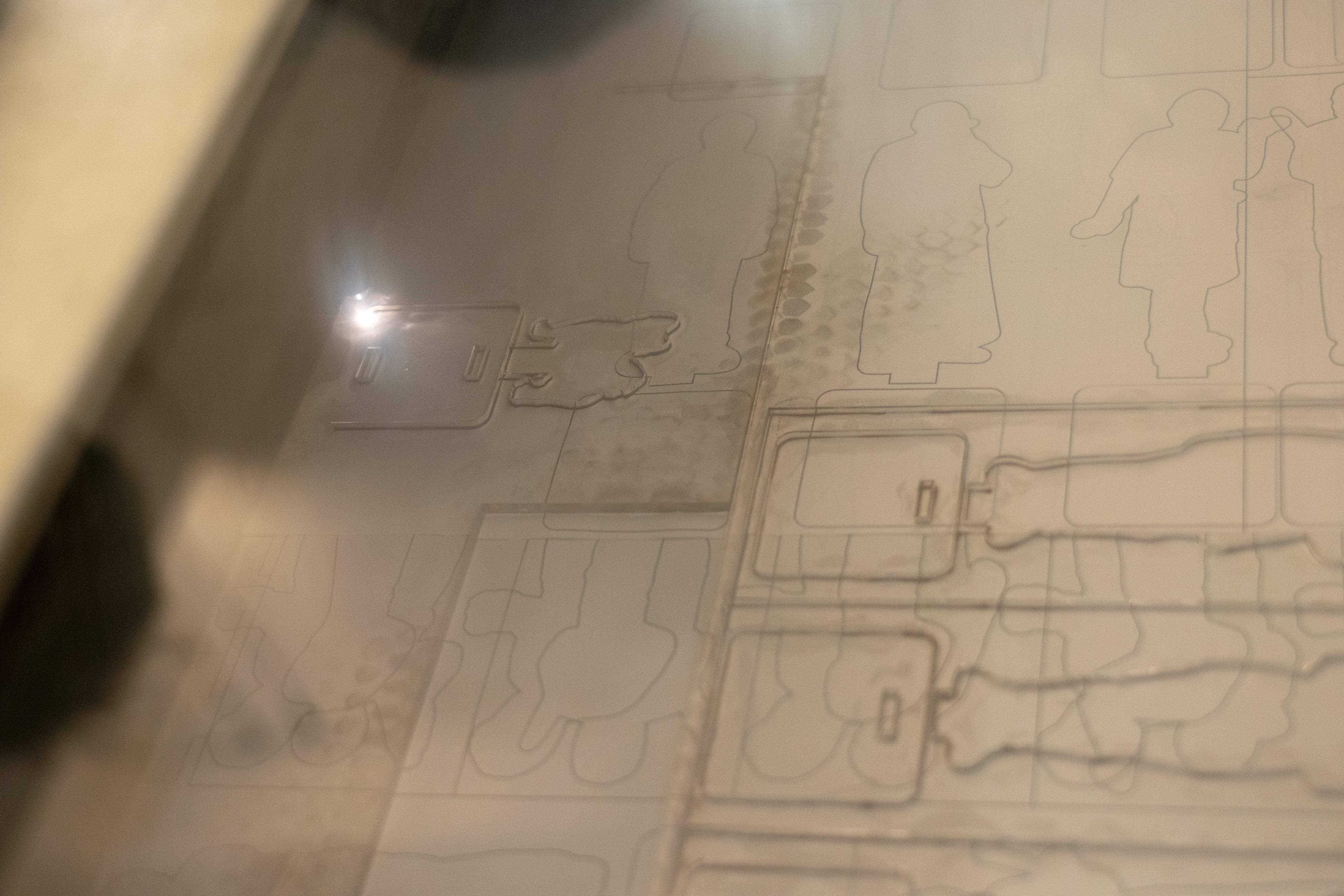 試作を通して分かったのは、回収したパーテーションの材料活用には、新品のアクリル板を使うよりも手間がかかることでした。店舗で使われていたパーティションを洗浄し、レーザーカッターで加工できるよう下処理を施し、パーテーションの形状に合わせてデータを作成しなければなりません。