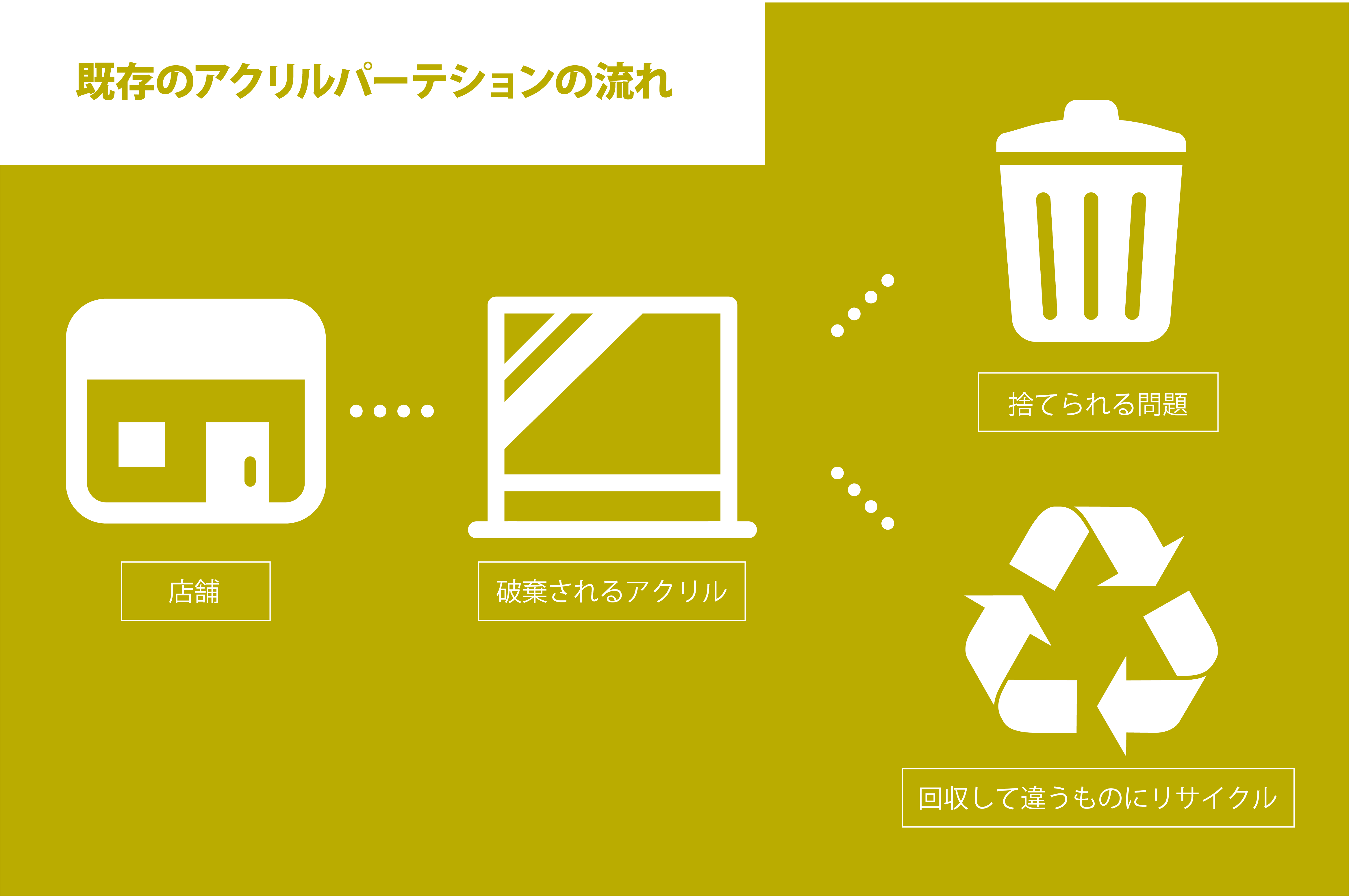 本プロジェクトでは、アクリル製のパーテーションの再活用を視野に入れる一方で、再活用がお店の応援につながることを目指しています。