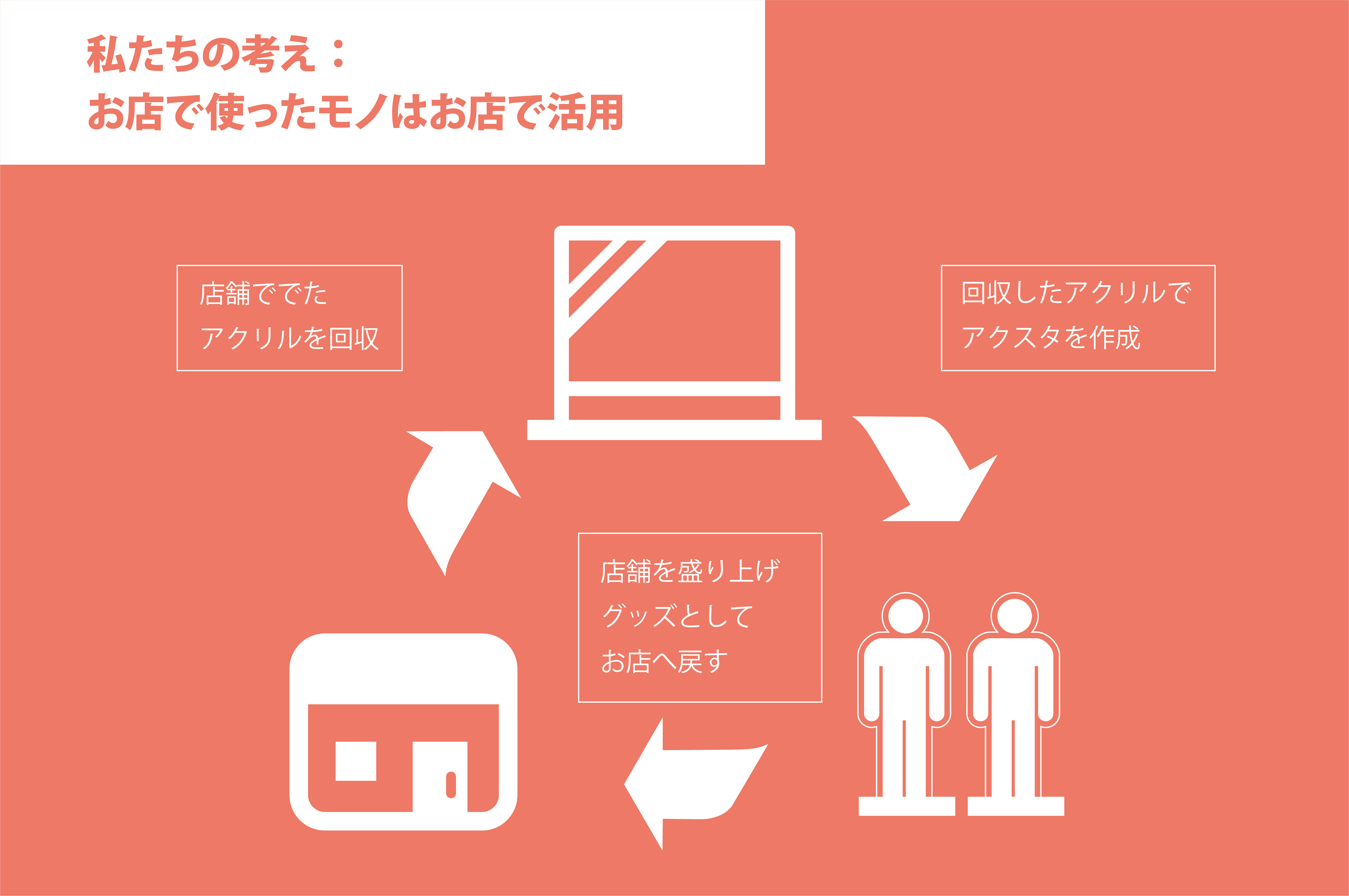 「お店で使ったアクリルは、お店で再活用したい!」がモットー。廃棄せず、お店で第2の活用を飲食店などで役目を終えたアクリル製のパーテーションを素材として活用するために回収し、「店の推し活」という新しい文化を作るためのグッズとして再利用します。