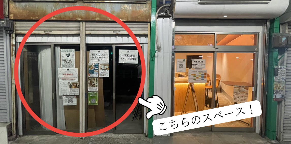 この部屋はKIKKAKE PLACE(シェアキッチン)正面向かって左のスペースに位置しています。