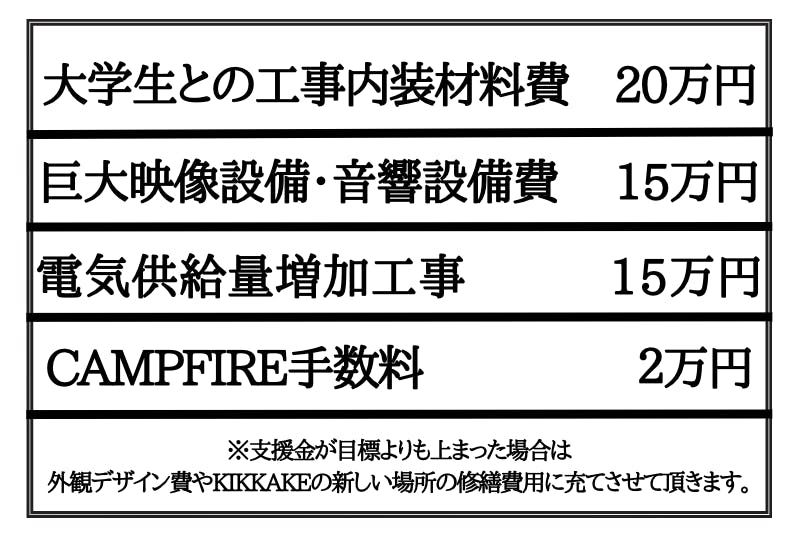 皆様にご支援いただいた資金は、大学生との改修工事、キャンプファイヤーへの手数料(17%)に充てさせていただきます。