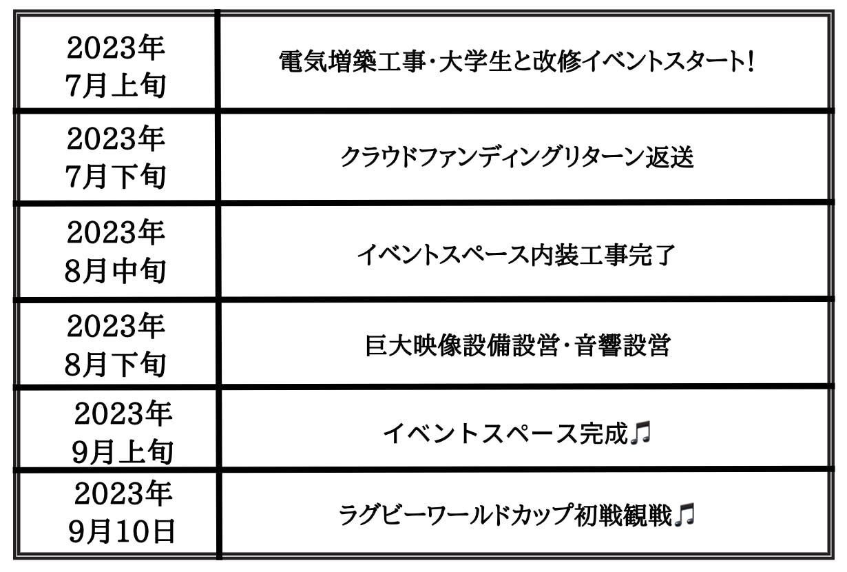 2023/09/11 10:59場所無事に完成いたしまして、9月11日より『KIKKAKE EVENT PLACE』が無事にオープンすることになりました。映画鑑賞、スポーツ観戦、マルシェ出店、貸切でパーティなど地域の方々が沢山の用途で使用してくれたら良いなと思います。これからも地域に密着した活動や場所作りをしていきます。今回ご支援くださった方々には是非一度ご来店頂けると嬉しいです。お待ちしております。株式会社スクリーフ 代表取締役 光山和弥 もっと見る