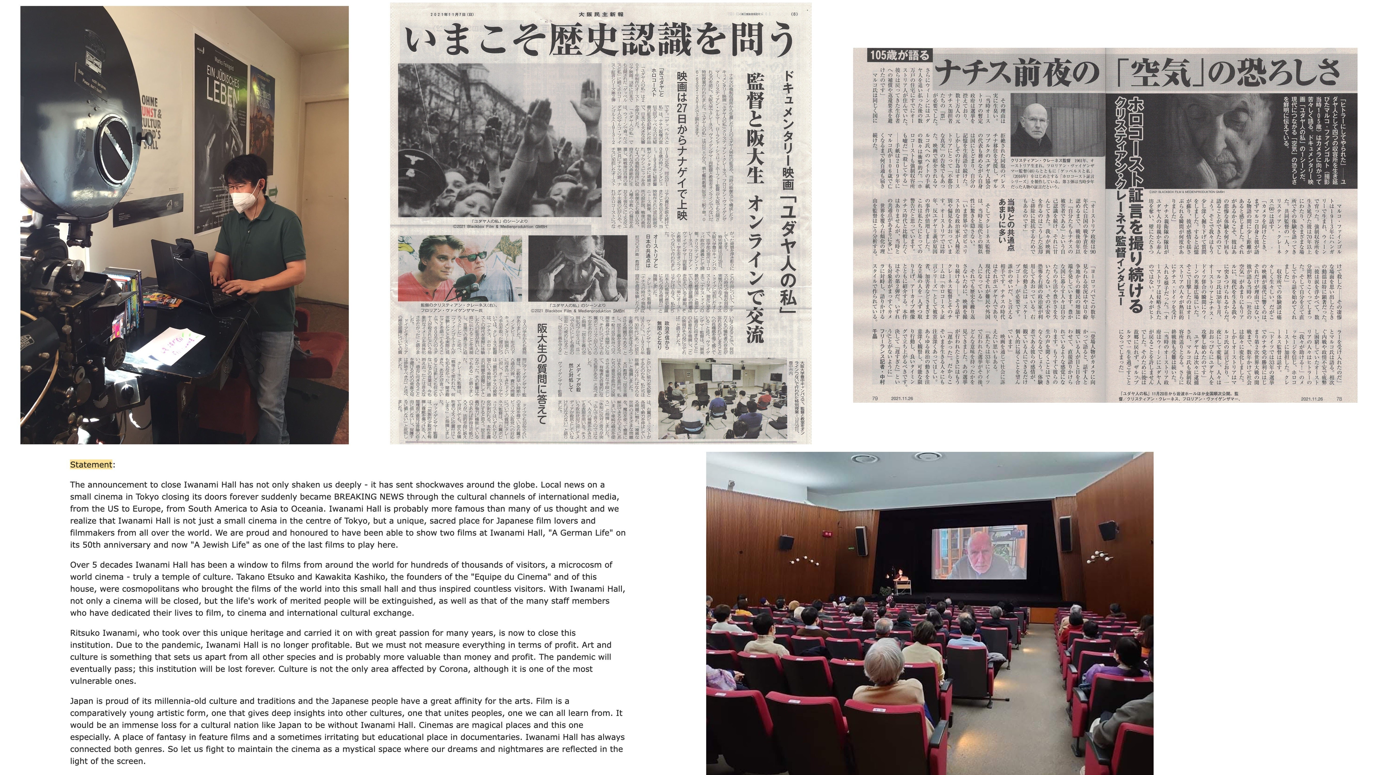 「ホロコースト証言シリーズ」は2018年から岩波ホールと取り組んできた企画でした。2018年に『ゲッベルスと私』を公開し、ウィーンからクリスティアン・クレーネス監督とフロリアン・ヴァイゲンザマー監督を招き、東京大学ドイツ・ヨーロッパ研究センターとの取り組みで、多くの学生や研究者を招き同研究室の石田勇治教授と公開での対談を実施しました。その後、大阪大学の木戸衛一教授に「現代ヨーロッパ政治」の講義に招かれ監督たちによる特別レクチャーを開講しました。講義では学生と現代のポピュリズムや戦争の歴史について意見交換し、映画を通じた教育的な国際交流が実現しました。映画を通じて日本の学術界とここまで密に取り組めたケースは稀で、私たち自身この取り組みにやり甲斐と社会的意義を感じ、この来日を経て私たちは監督たちが進めている「ホロコースト証言シリーズ」の続編を岩波ホールで完結させることを決意しました。3年後の2021年、コロナ感染症が猛威を振るう中、緊急事態宣言の発令に伴い岩波ホールを含めた全国の映画館が一時的な休館を強いられましたが、オンラインを駆使したハイブリッド型の活動を実施しながら公開の準備を進め、2021年11月にシリーズ2作目となる『ユダヤ人の私』を岩波ホールで無事に公開することができました。しかし、作品が上映中の2022年1月11日、出口の見えないコロナ渦で、岩波ホールはその54年の歴史に幕を閉じることを発表しました。