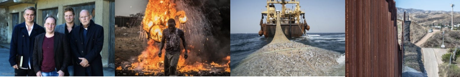 写真・左から)チームの写真/アフリカで最終的に処分されている欧州のゴミ問題/世界の海で行われている海洋資源の乱獲問題/世界を分断する壁の歴史